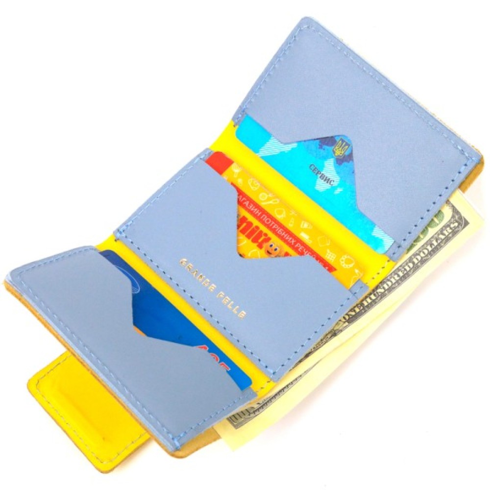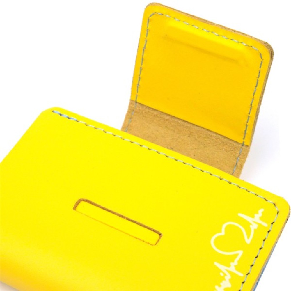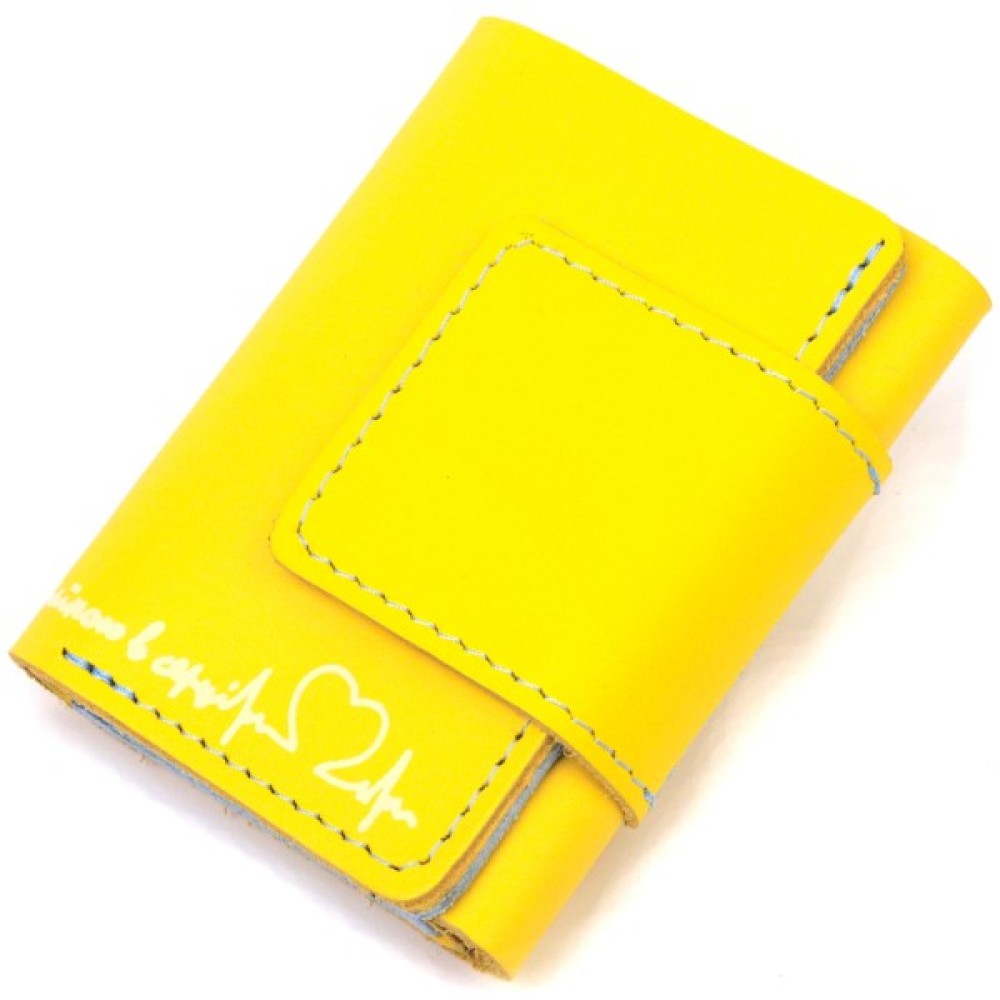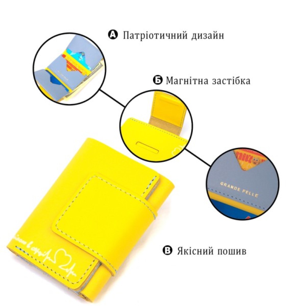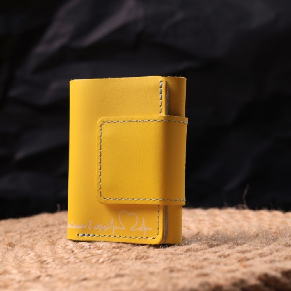 Надійний шкіряний гаманець, у комбінації двох кольорів жовтого зовні та блакитного всередині з патріотичним написом “З Україною в серці”. Виріб пошитий із якісної гладкої шкіри, з високими показниками зносостійкості. Портмоне має одне велике відділення для купюр усіх номіналів, а також достатню кількість відділень для карток, застібається виріб на надійні магніти. Шкіряний гаманець стане чудовим подарунком на всі випадки життя.