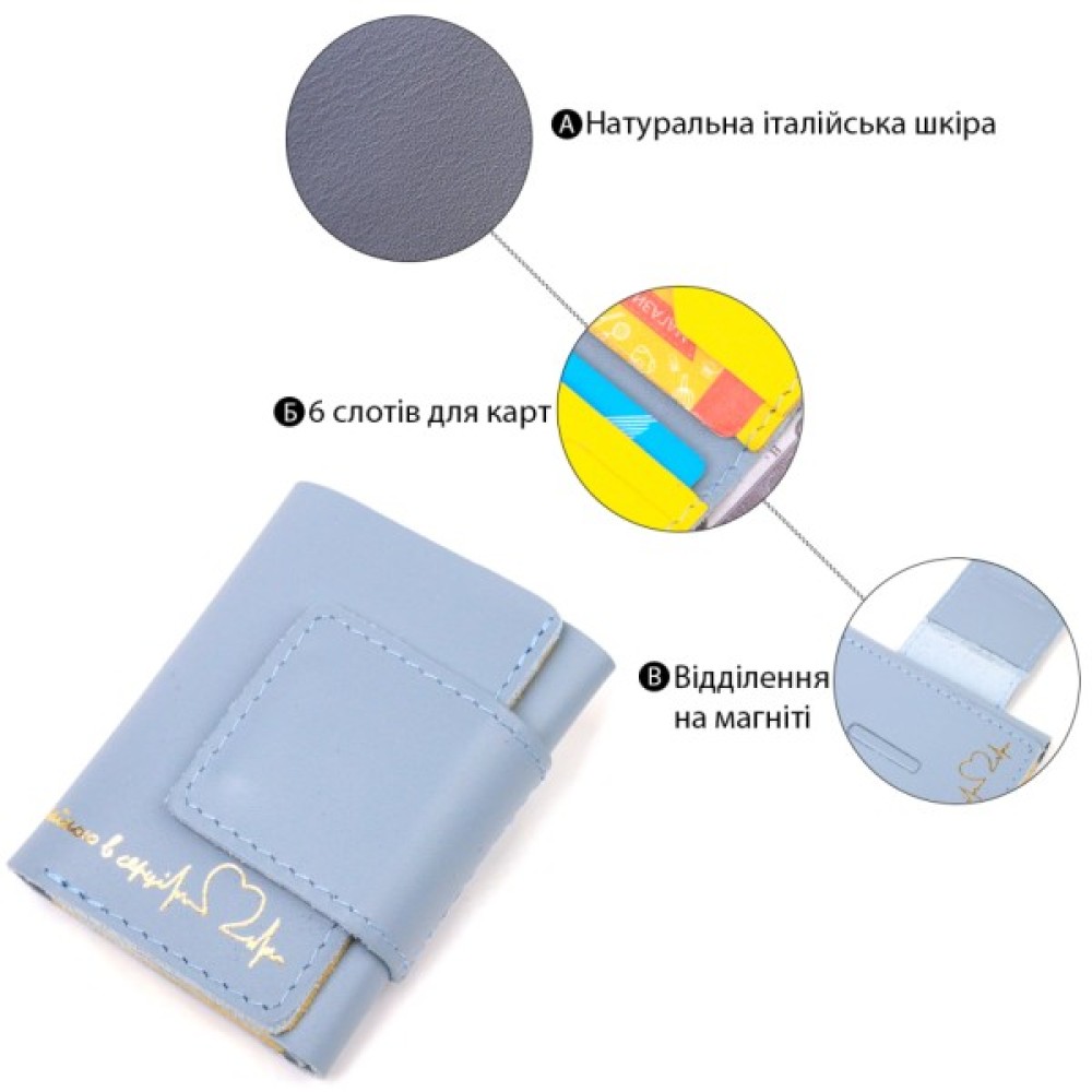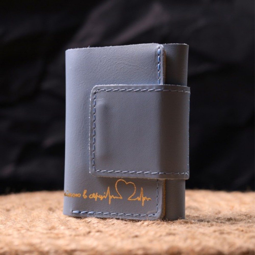 Надійний шкіряний гаманець, у комбінації двох кольорів жовтого зовні та блакитного всередині з патріотичним написом “З Україною в серці”. Виріб пошитий із якісної гладкої шкіри, з високими показниками зносостійкості. Портмоне має одне велике відділення для купюр усіх номіналів, а також достатню кількість відділень для карток, застібається виріб на надійні магніти. Шкіряний гаманець стане чудовим подарунком на всі випадки життя.