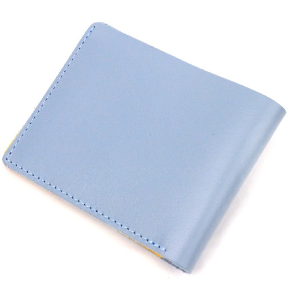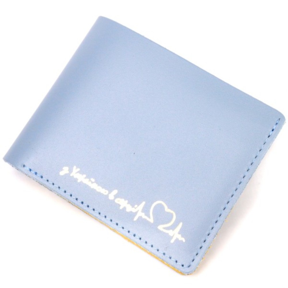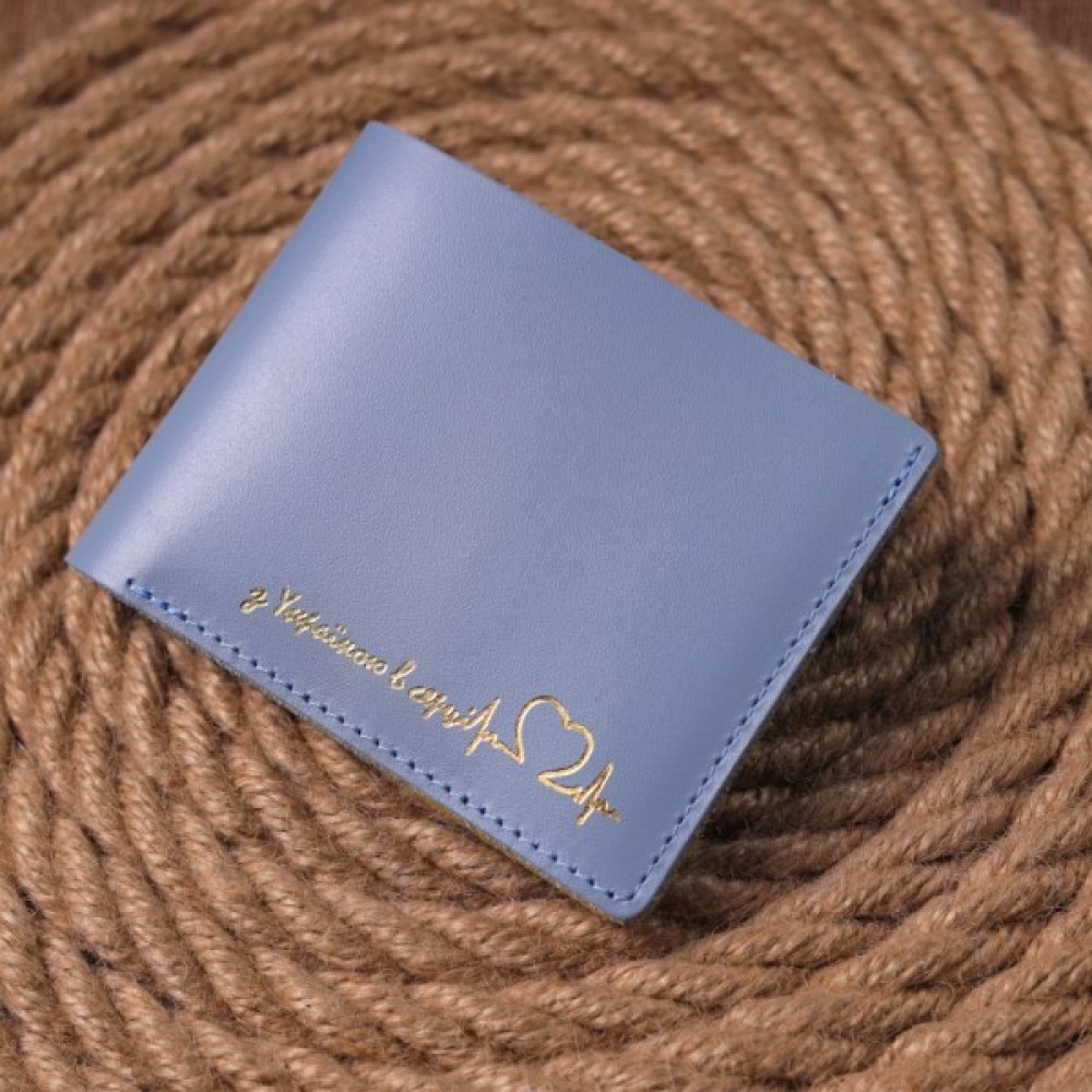 Стильний шкіряний гаманець, у комбінації двох кольорів блакитного зовні та жовтого всередині з патріотичним написом “З Україною в серці”. Виріб пошитий із якісної шкіри, з високими показниками зносостійкості.