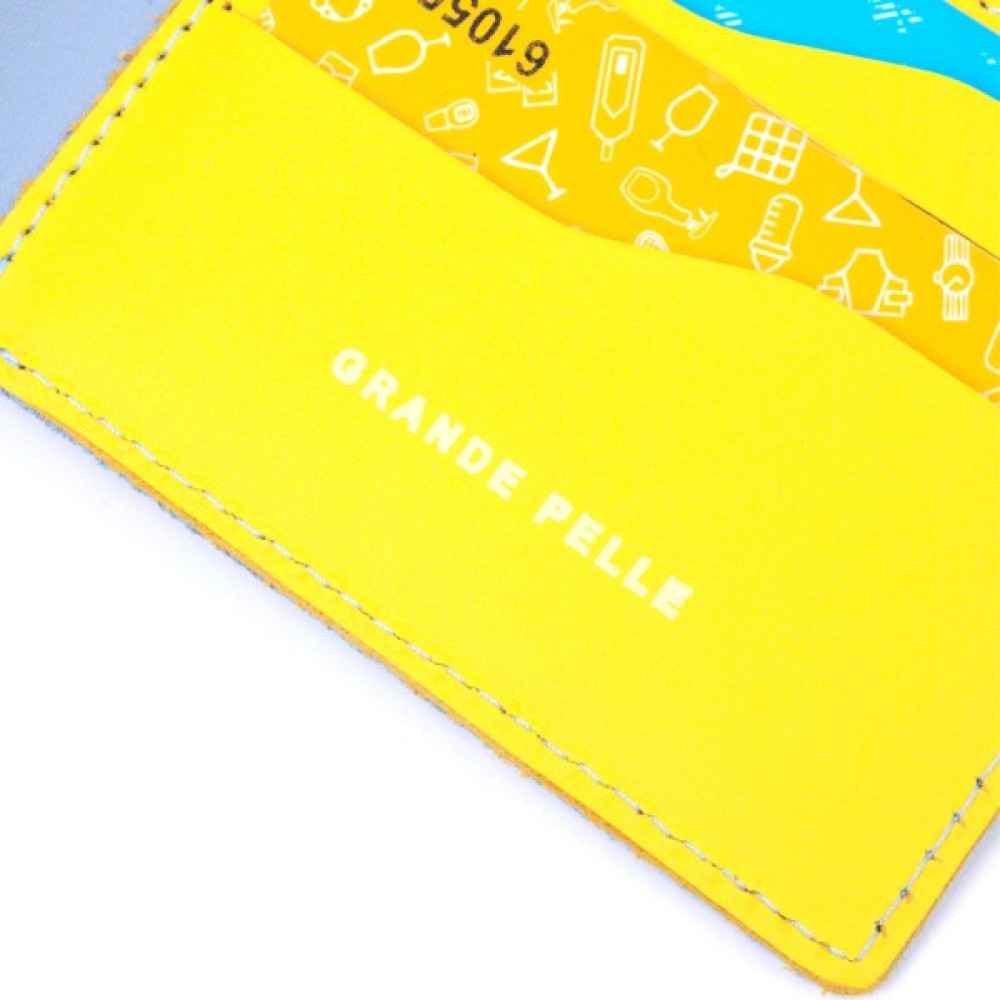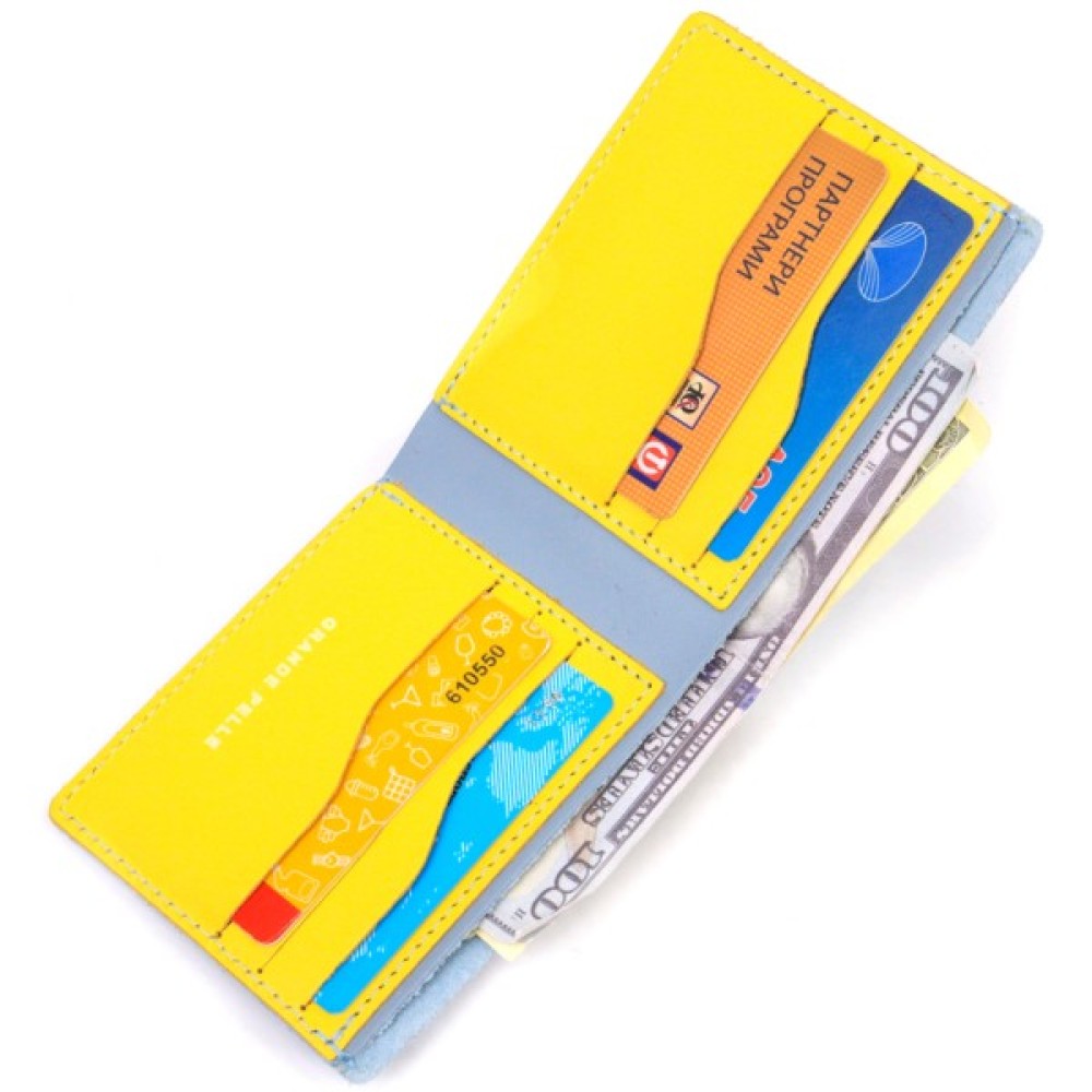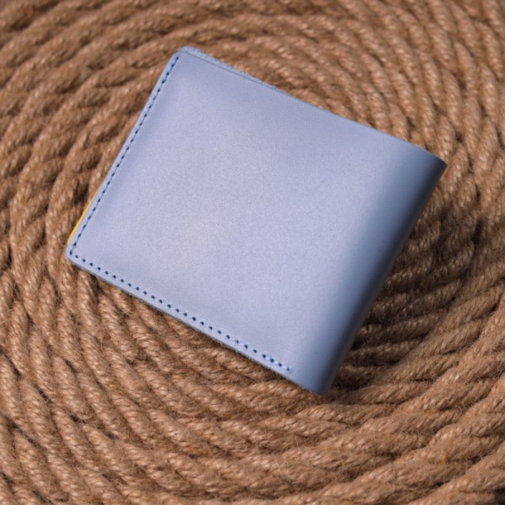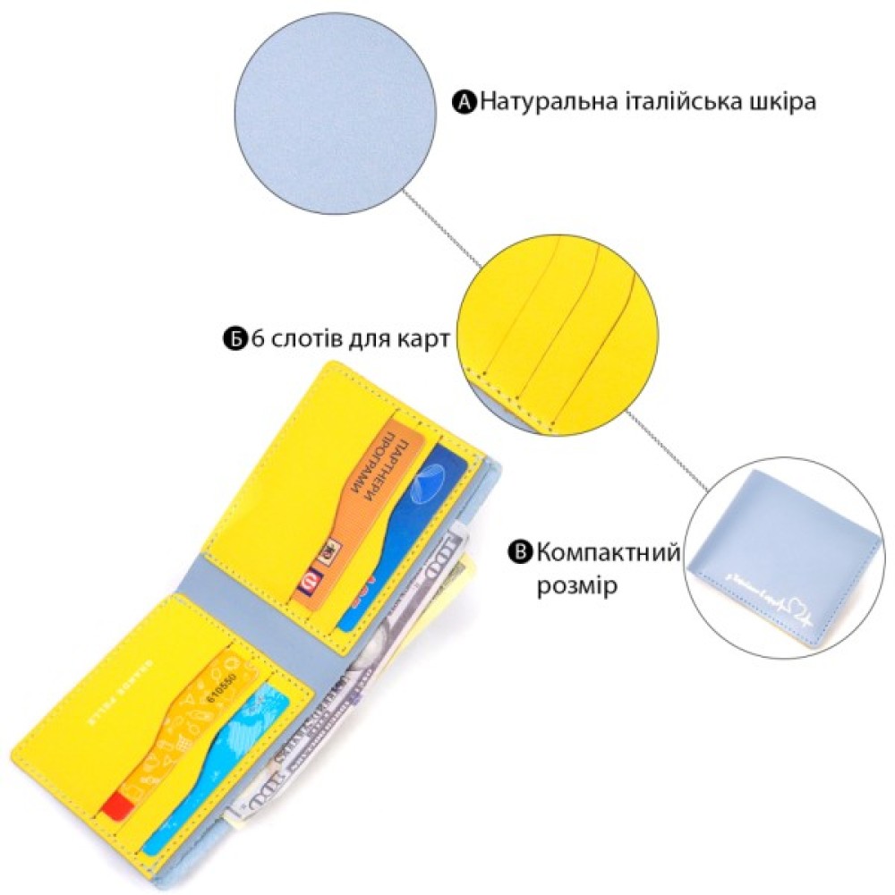 Стильний шкіряний гаманець, у комбінації двох кольорів блакитного зовні та жовтого всередині з патріотичним написом “З Україною в серці”. Виріб пошитий із якісної шкіри, з високими показниками зносостійкості.