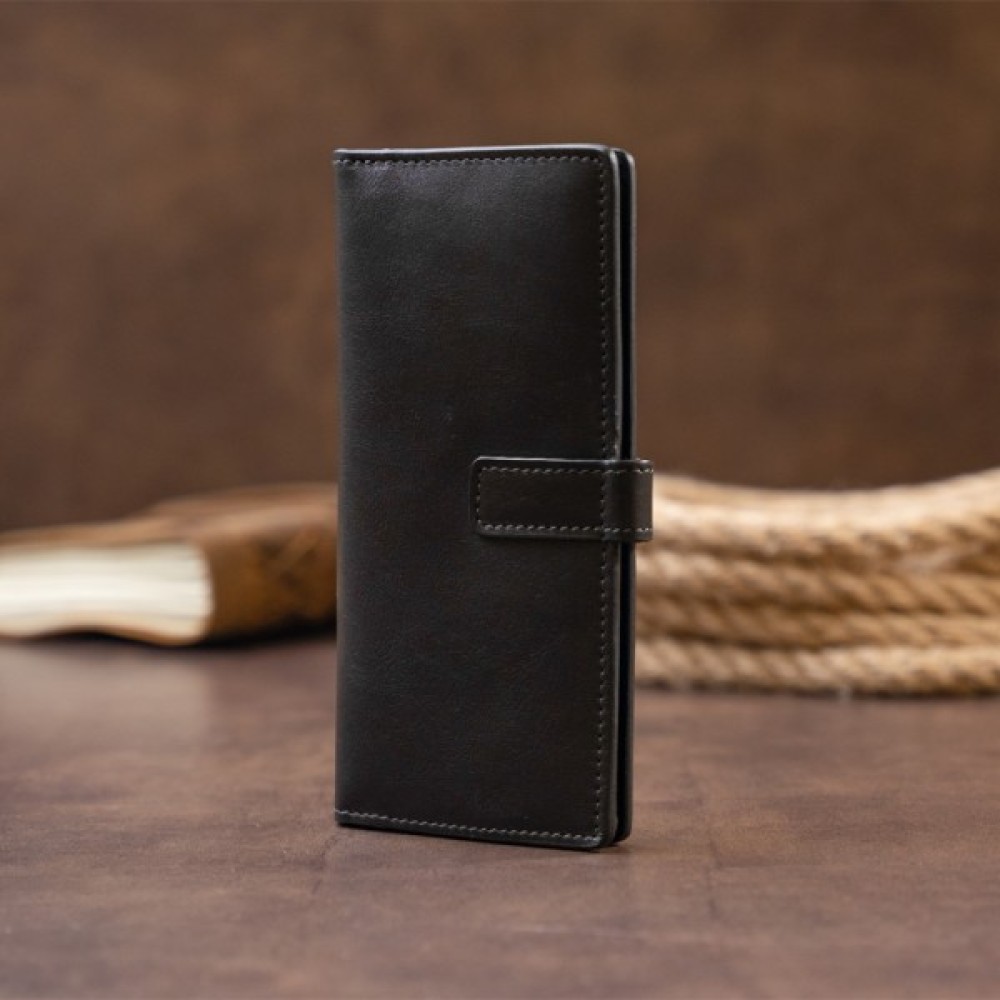 Вертикальний гаманець у глянцевій шкірі, яка виглядає дуже дорого.