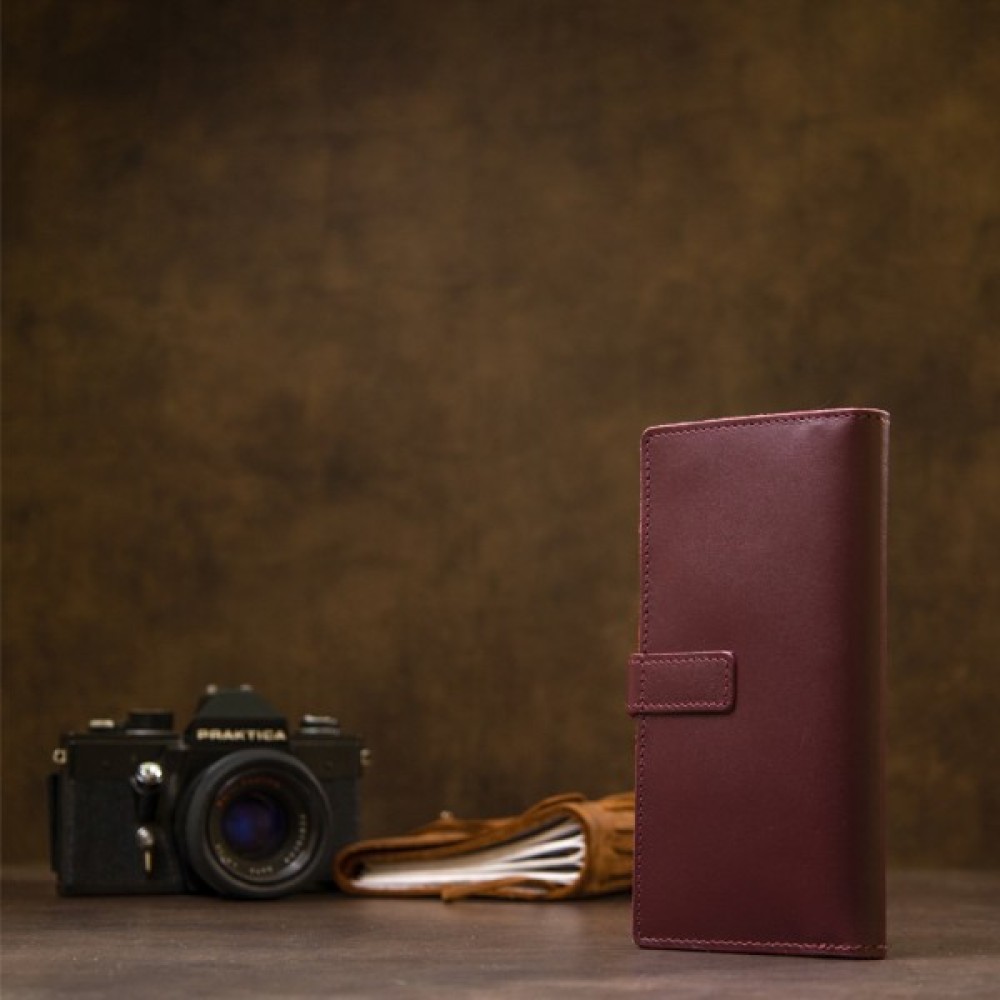 Красиве і багатофункціональне портмоне з висококласної натуральної шкіри. Закривається на хлястик з металевою кнопкою. Наповнення представлено у вигляді практичних відділень для купюр, монет і слотів для кредитних і візитних карток.