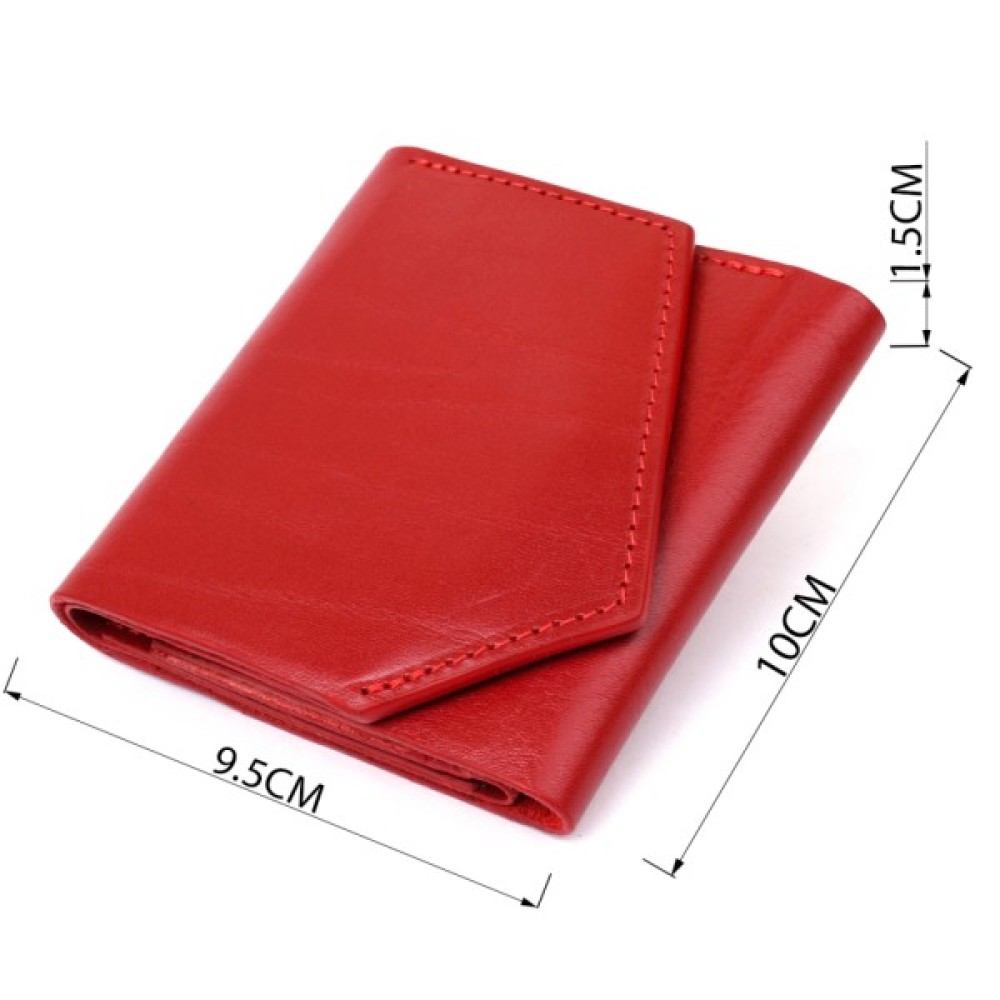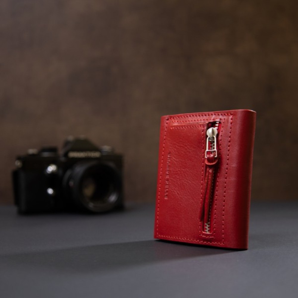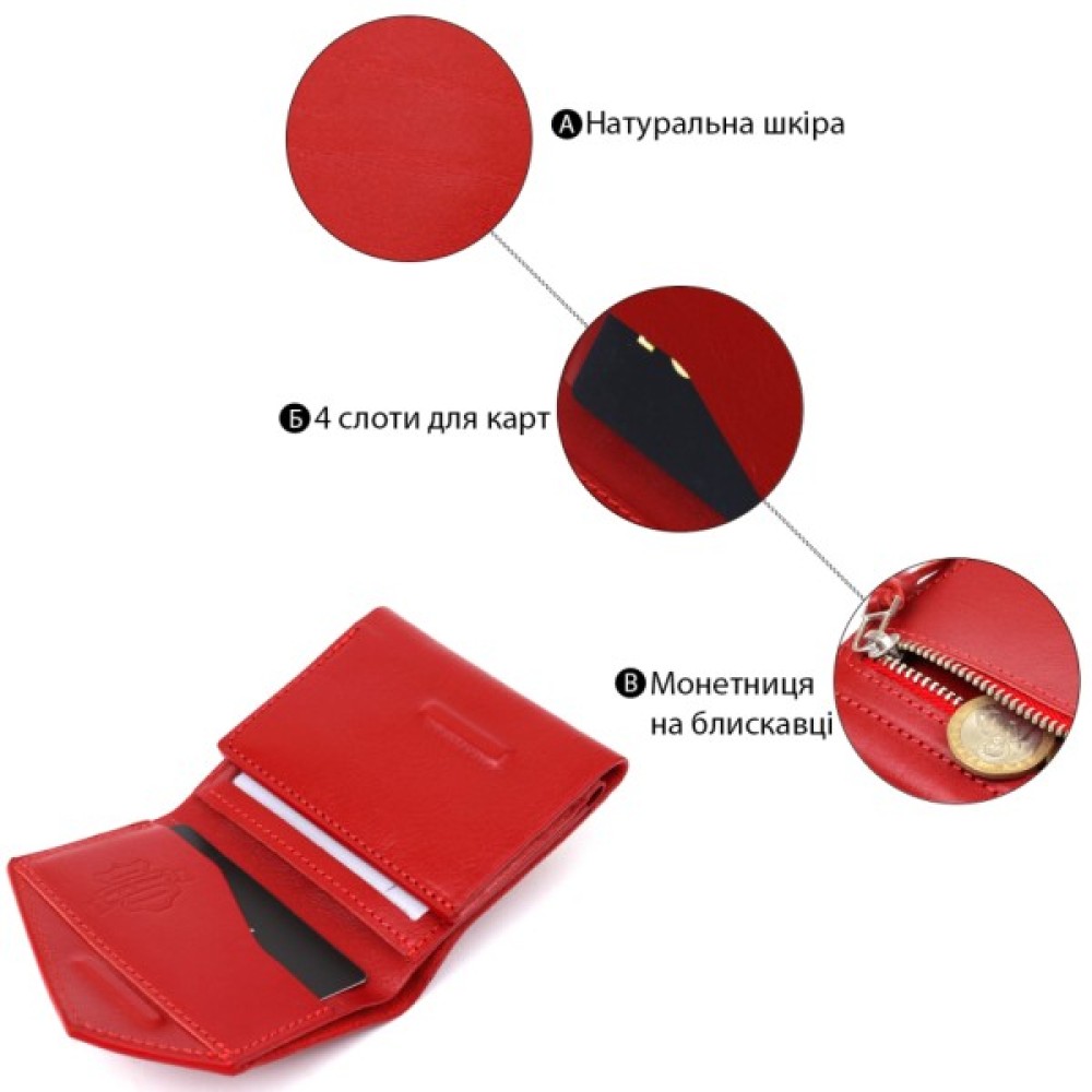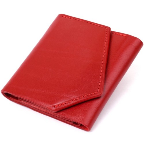 Гарний жіночий гаманець з оригінальним скошеним клапаном на магніті. Всередині має просторе відділення на всю довжину для купюр, слоти для пластикових карт і доступну монетницю на блискавці на зовнішній стороні. Матеріал виготовлення - натуральна шкіра високого класу. Колір виробу - соковитий червоний.
