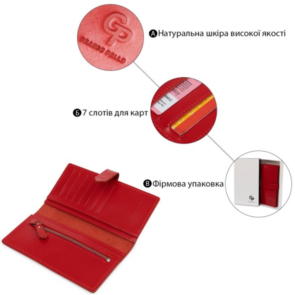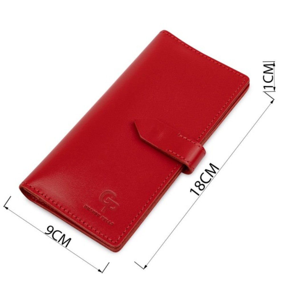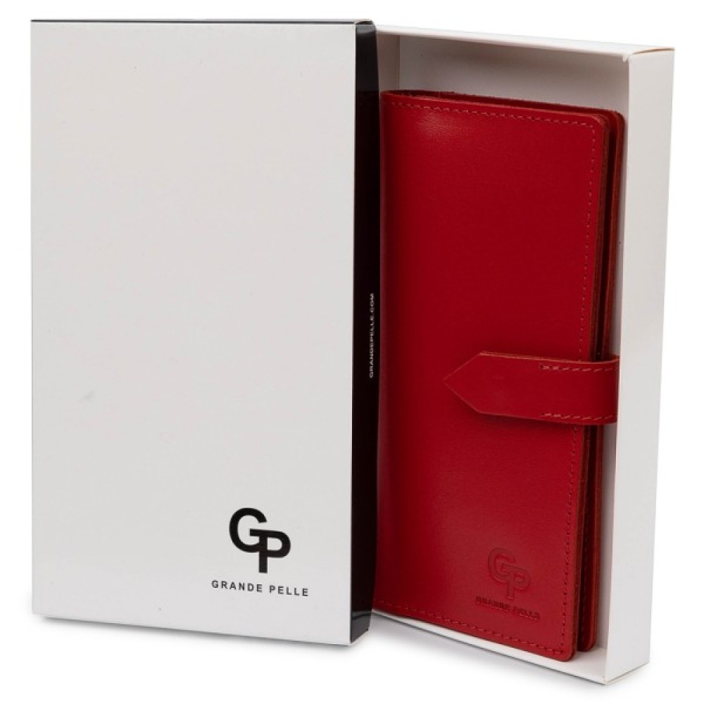 Матеріал: натуральна шкіра. Колір: бордовий. Розміри (ШхВхГ, см): 9х18х1 см. Країна виробник: Україна. Бренд: GRANDE PELLE. Опис: - закривається на кнопку; - всередині 4 відділення на всю довжину; - монетниця на блискавці; - 7 кишень для карток Красиве матове жіноче портмоне в бордовому кольорі з відтінком стиглої вишні. Виготовлений виріб з натуральної шкіри з високими показниками міцності. Закривається аксесуар на зручну практичну кнопку. Усередині розташувалися відділення на всю довжину для купюр, монетниця на блискавці і слоти для кредитних карт або візиток. Упаковано портмоне в фірмову картонну коробку.