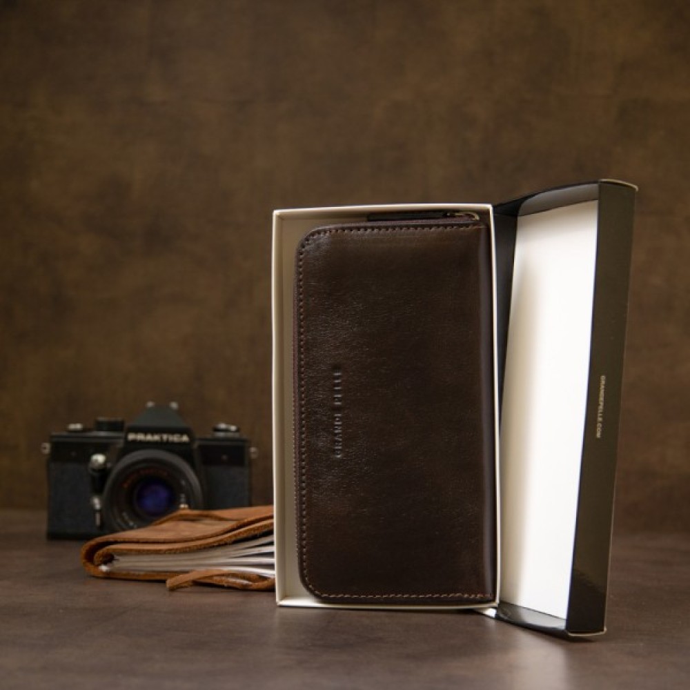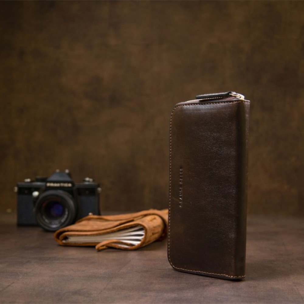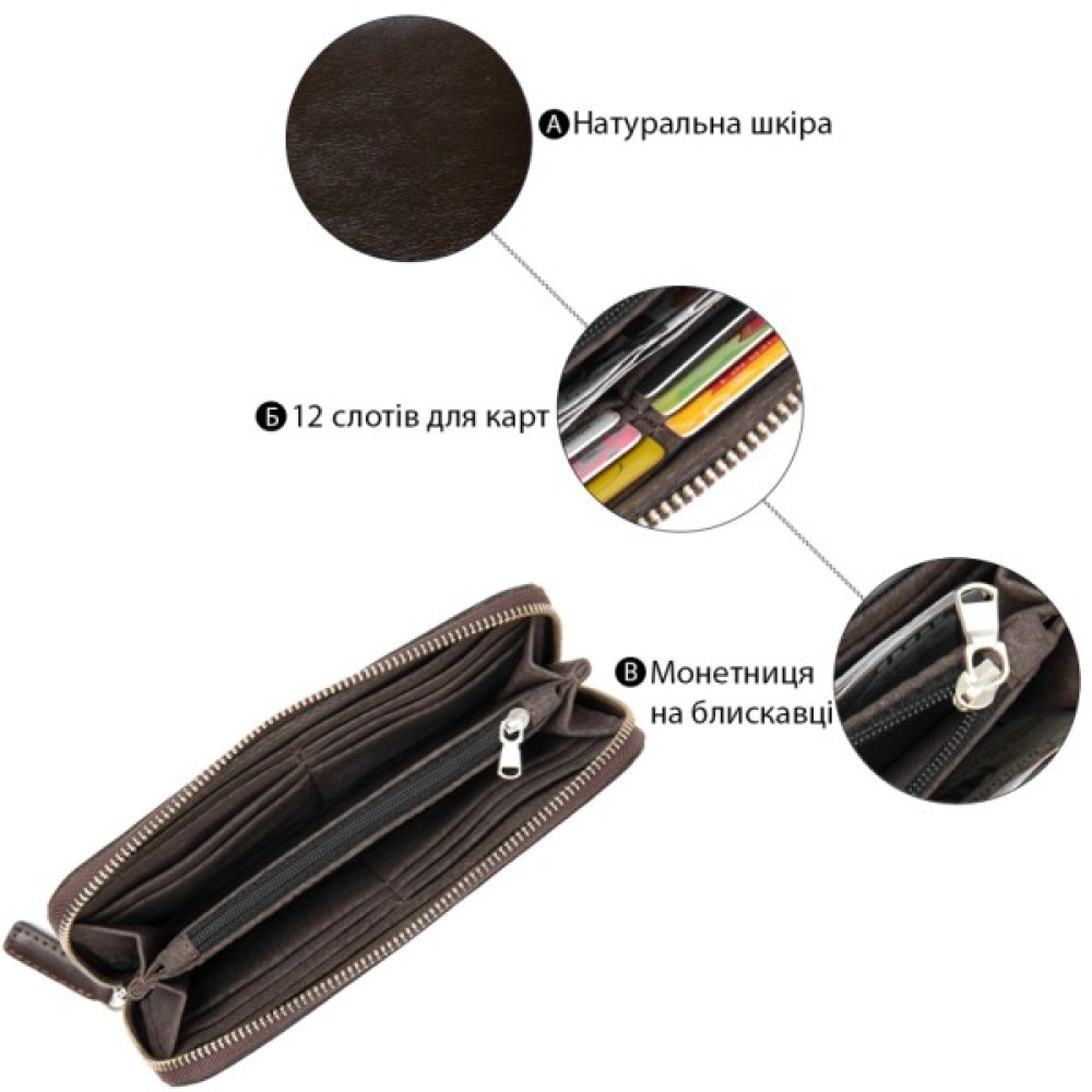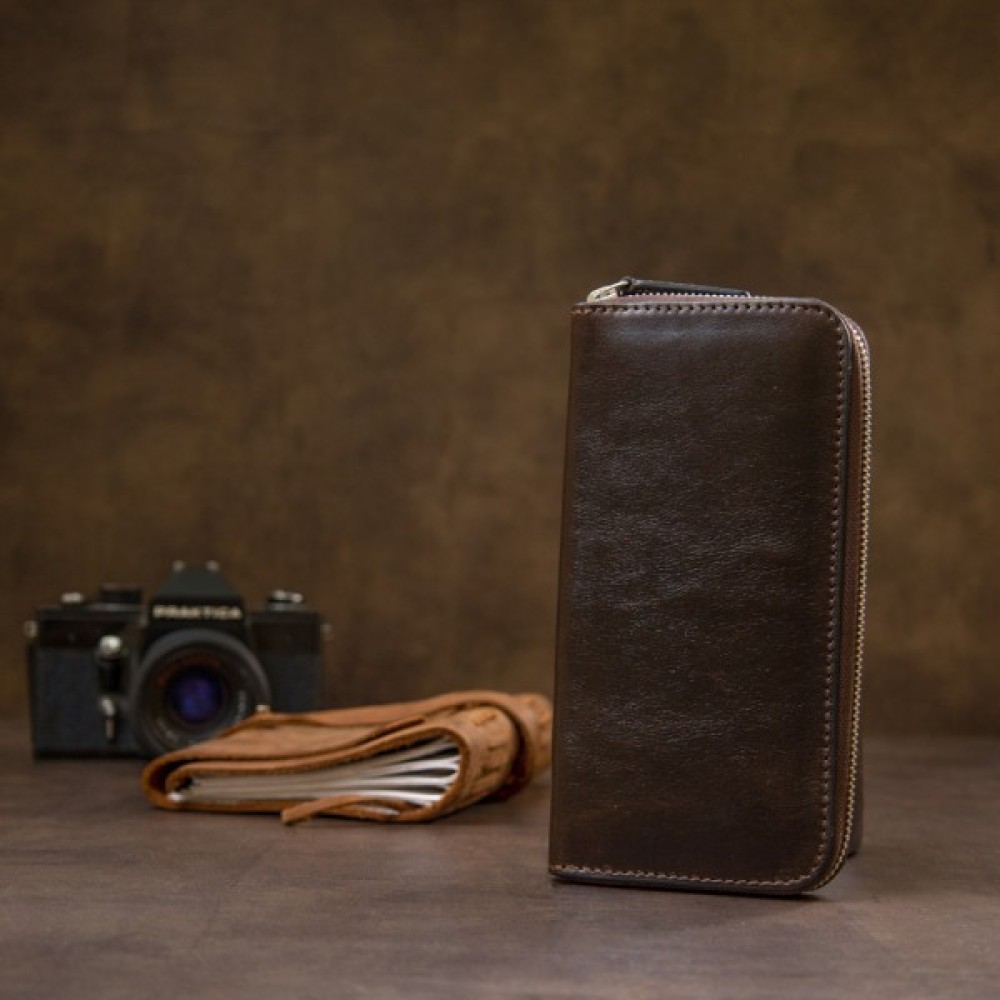 Практичне портмоне на блискавці для жінок. Виконано з натуральної високоякісної шкіри, гладкої і приємної на дотик. Усередині присутні місткі відділення для купюр, дрібниці і слоти для кредитних і візитних карток.