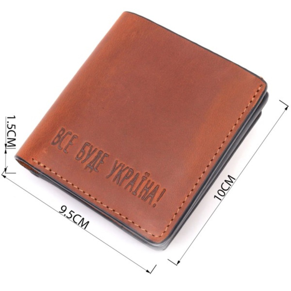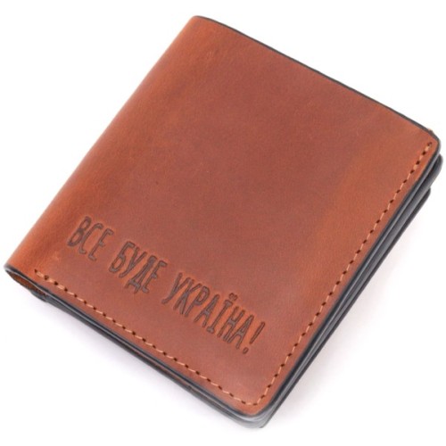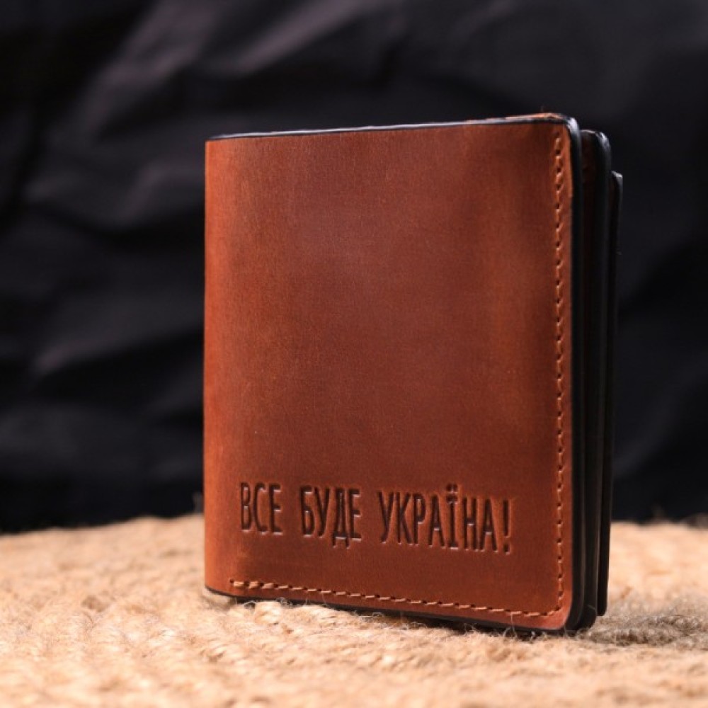 Чудовий шкіряний гаманець у світло-коричневому кольорі з патріотичним написом "Все буде Україна".