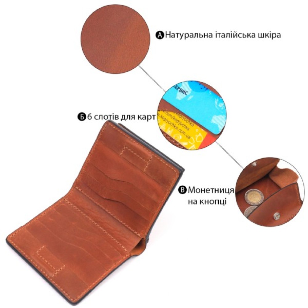Портмоне має два великі відділення для купюр усіх номіналів, достатню кількість слотів для карток та монетницю, закривається на надійний магніт.