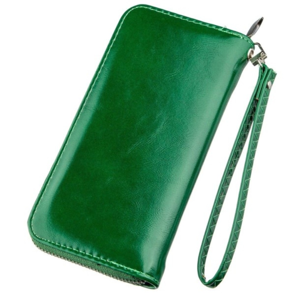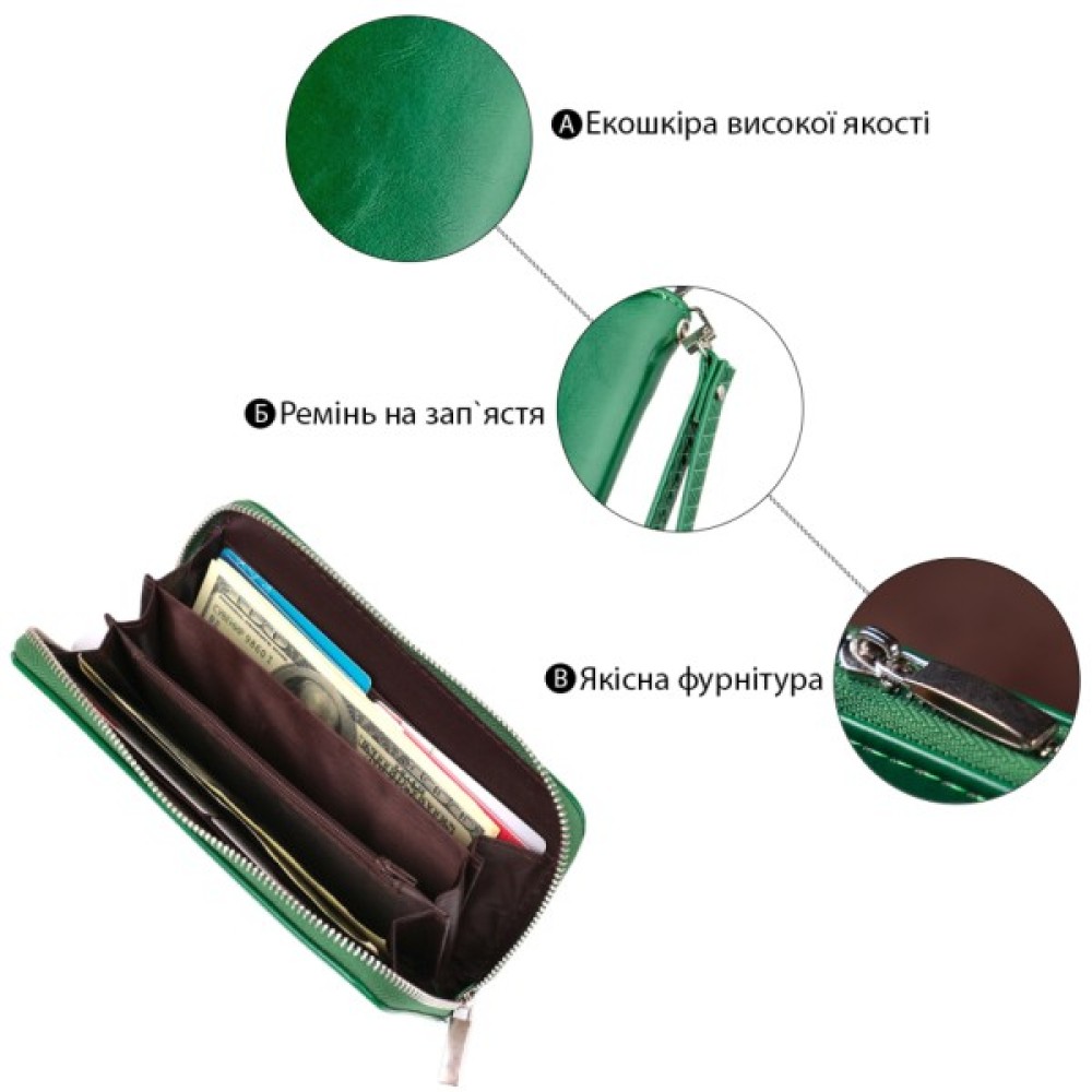 Ви можете носити цей гаманець як клатч. Виріб виконаний із гладкої екошкіри, яка приємно блищить на сонці. Усередині — комбінація екошкіри та міцного текстилю.