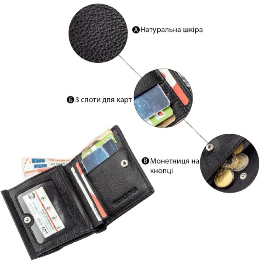 Усередині передбачено усе необхідне: зручні відділення для купюр, блискавична кишеня для цінностей, монетниця на кнопці, відділення для фото близьких і карток.
