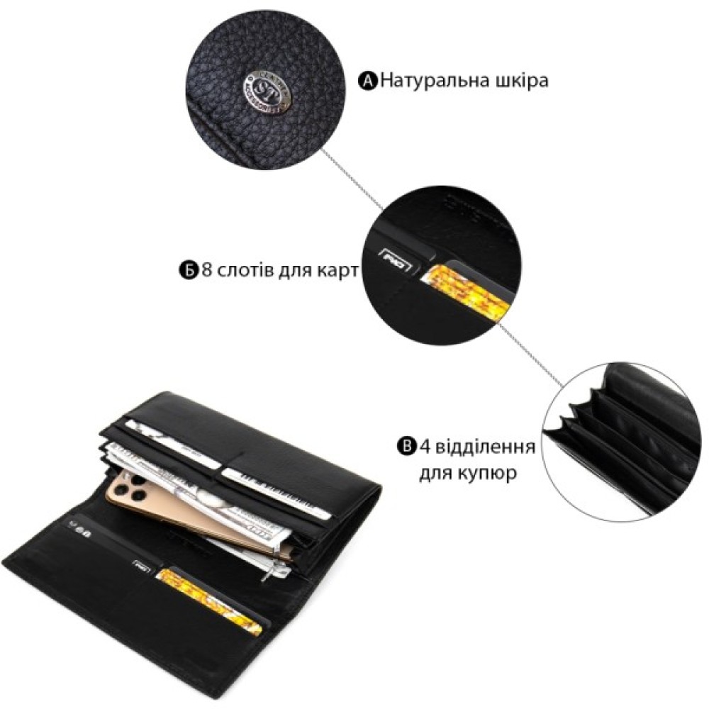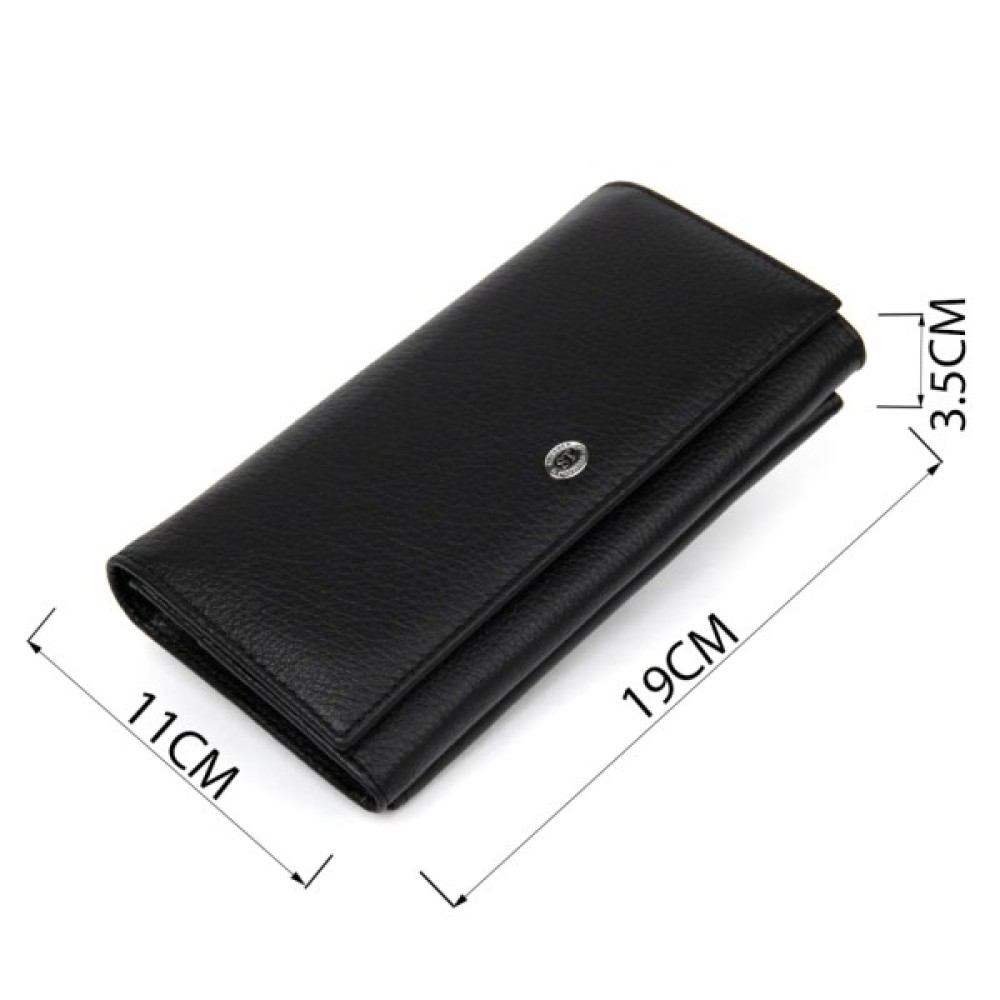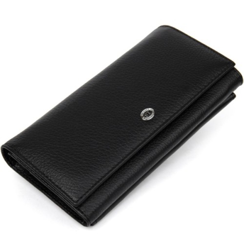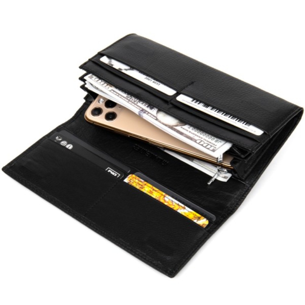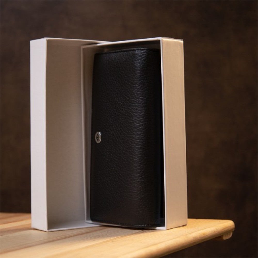 Місткий гаманець з натуральної м'якої шкіри в універсальному чорному кольорі. Має добре продуманий дизайн, що дуже важливо в сучасному світі. Всі свої цінні речі можна помістити в цей функціональний гаманець, завдяки безлічі відділень і кишень. Також цікавим моментом є зовнішня монетниця на двох магнітах, що виглядає незвично, але дуже практично.