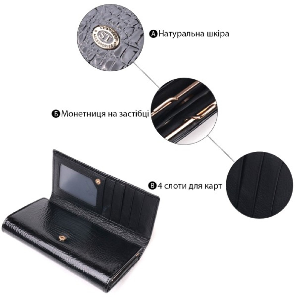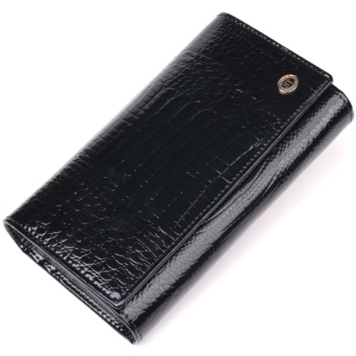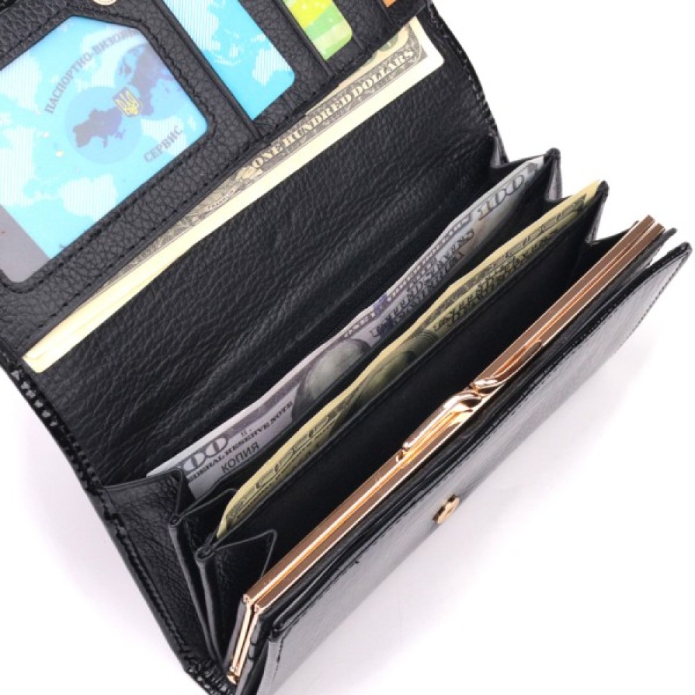 Візитниця розташована на зовнішній стороні, гаманець закривається клапаном на кнопку.
