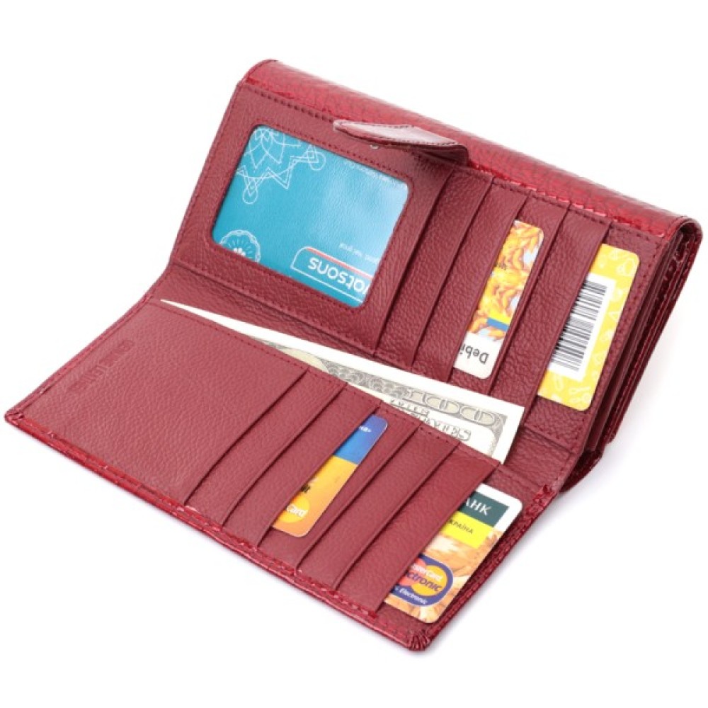 Місткий жіночий гаманець із високоякісної лакованої шкіри з тисненням під рептилію. Має все необхідне, щоб стати Вам незамінним аксесуаром у повсякденному рутинному житті. Ви легко помістите в нього паперові купюри, монети, документи.
