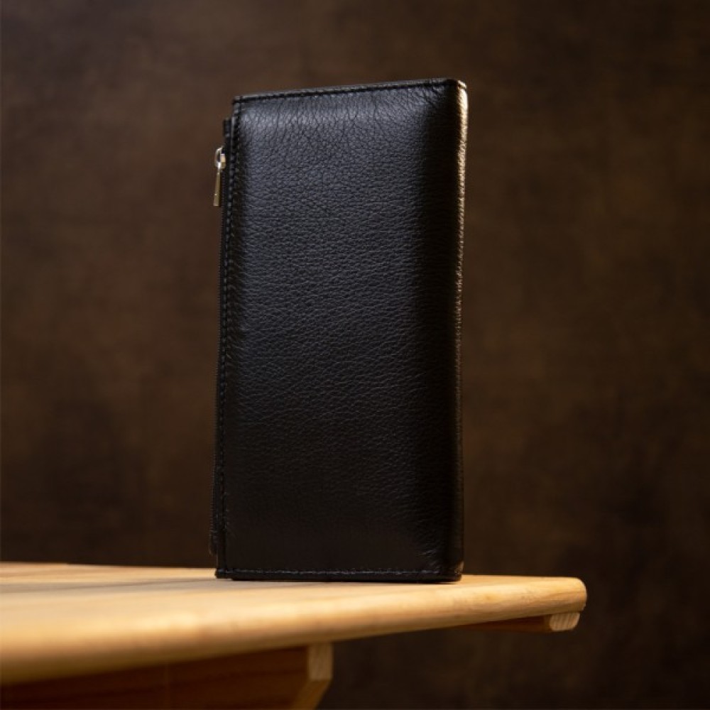 Хороший добротний жіночий гаманець у класичному чорному кольорі. Виготовлений з м’якої натуральної шкіри, яка має відмінні експлуатаційні характеристики.