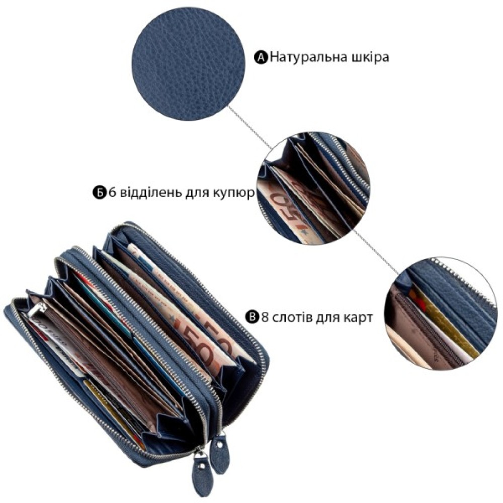 Всередині є шість великих відділень на всю довжину гаманця, відділення на блискавці для цінних і дрібних речей, кишені для карток і візиток.