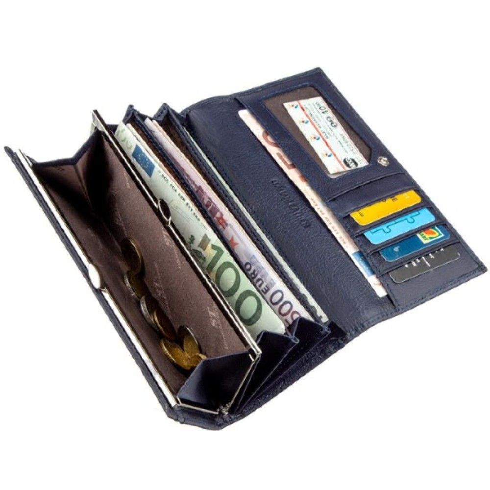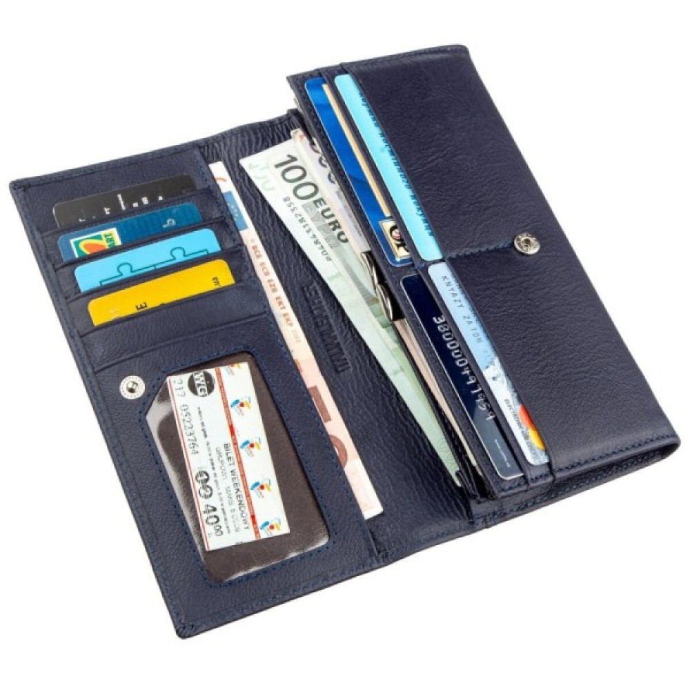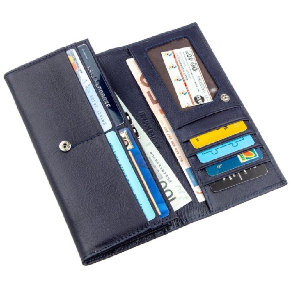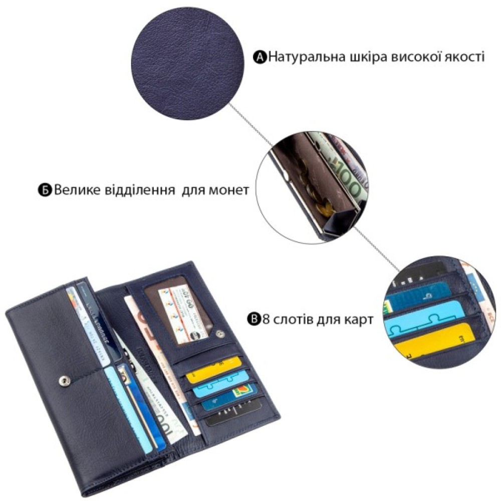 Виразний гаманець для чудових жінок будь-якого віку і положення. Якісно виконаний з натуральної шкіри з зернистою фактурою. Колір темно-синій, тому підійде під будь-який гардероб. Виглядає аксесуар дуже стильно і модно. Наповнення гаманця представлено у вигляді трьох основних відділень, відділення на блискавці, монетниці на клямці, кишень для карток і візиток, а також зовнішнього відділення на тильній стороні виробу. Даний аксесуар стане прекрасним подарунком, не тільки для Вас, але і для близької людини.