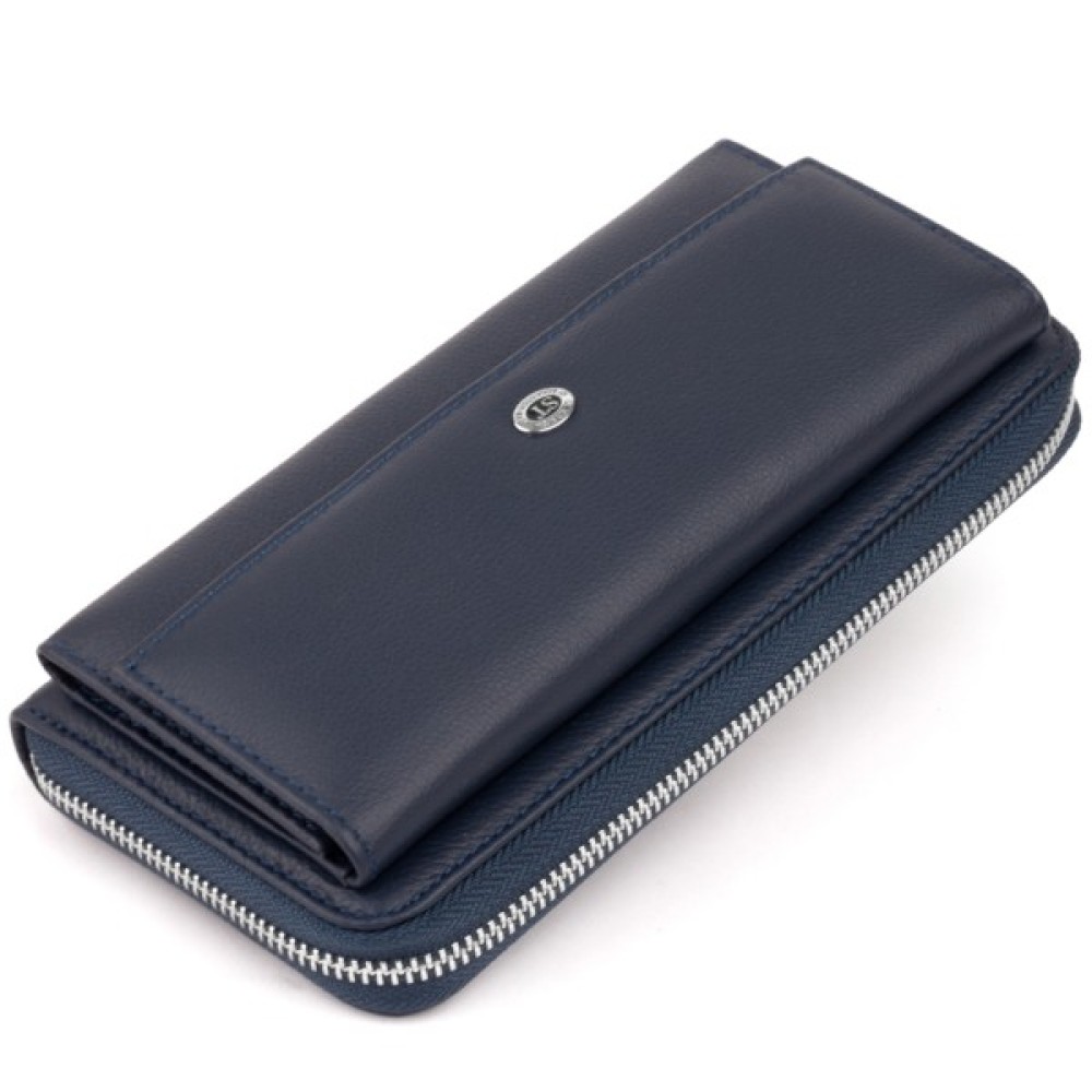 Найзручніший і найголовніше місткий жіночий гаманець. Виконана модель в темно-синьому приглушеному кольорі з натуральної м'якої та еластичної шкіри. В моделі дві автономних частини (під купюри і друга під кредитки). Гаманець ви можете носити як клатч за допомогою ремінця на зап'ясті. Його сучасний і продуманий дизайн не залишить вас байдужими. З таким виробом ви можете бути впевнені, що купюри не помнуться і будуть в повному порядку. Варто відзначити, що в моделі досить відділень, щоб розкласти всі гроші, картки і навіть вмістити телефон. Усередині виріб виготовлений з натуральної шкіри в поєднанні з щільним текстилем. Рекомендуємо вам дану модель, якщо ви перебуваєте в пошуку подарунка для дівчини.