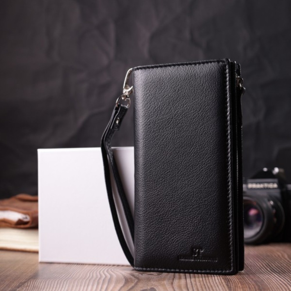 Місткий гаманець-клатч унісекс, в який легко вміщується телефон. Особливістю моделі є можливість носити його на кисті завдяки знімному шкіряному кистьовому ременю