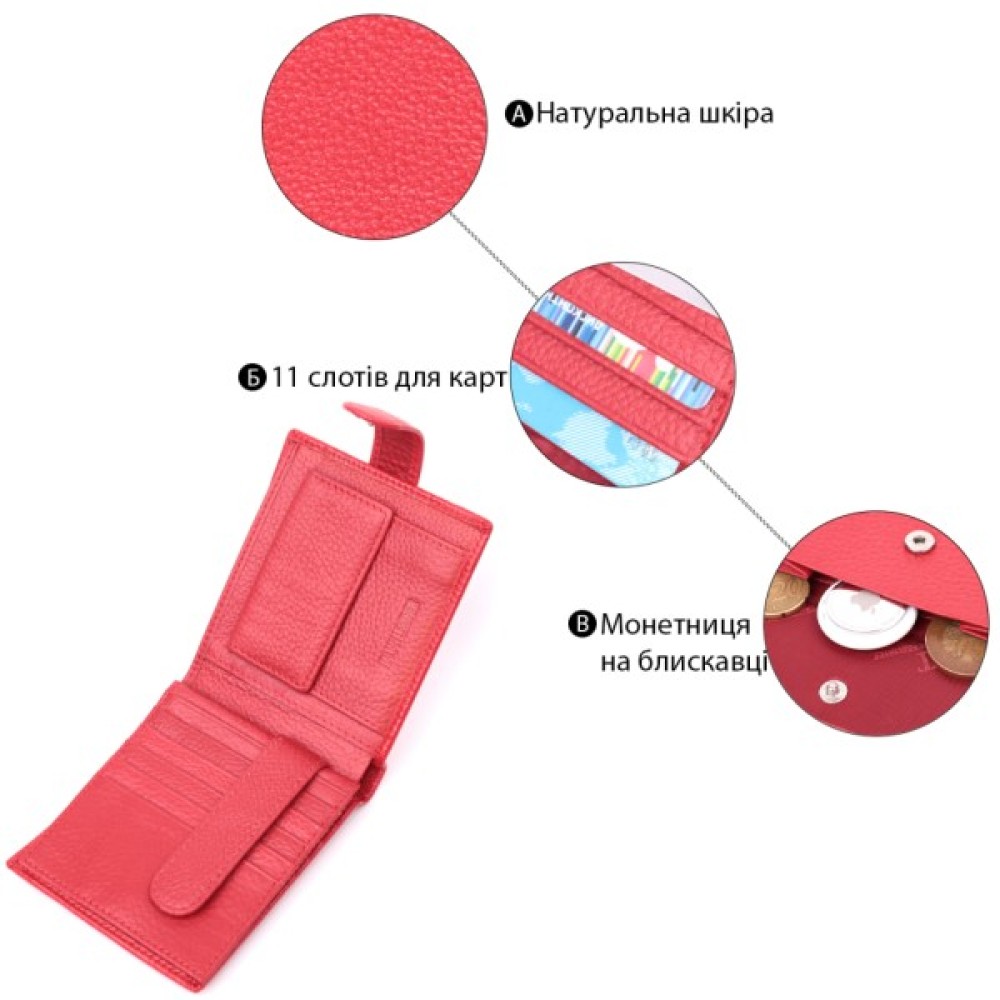 Жіноче яскраве портмоне середнього розміру, що закривається хлястиком на кнопку. Модель пошита з якісної шкіри, яка чудово проявила себе у довгостроковій експлуатації. Аксесуар складається з двох відділень для купюр, двох прихованих кишень, одинадцяти осередків для пластикових карток, кишені під плівкою та монетниці.