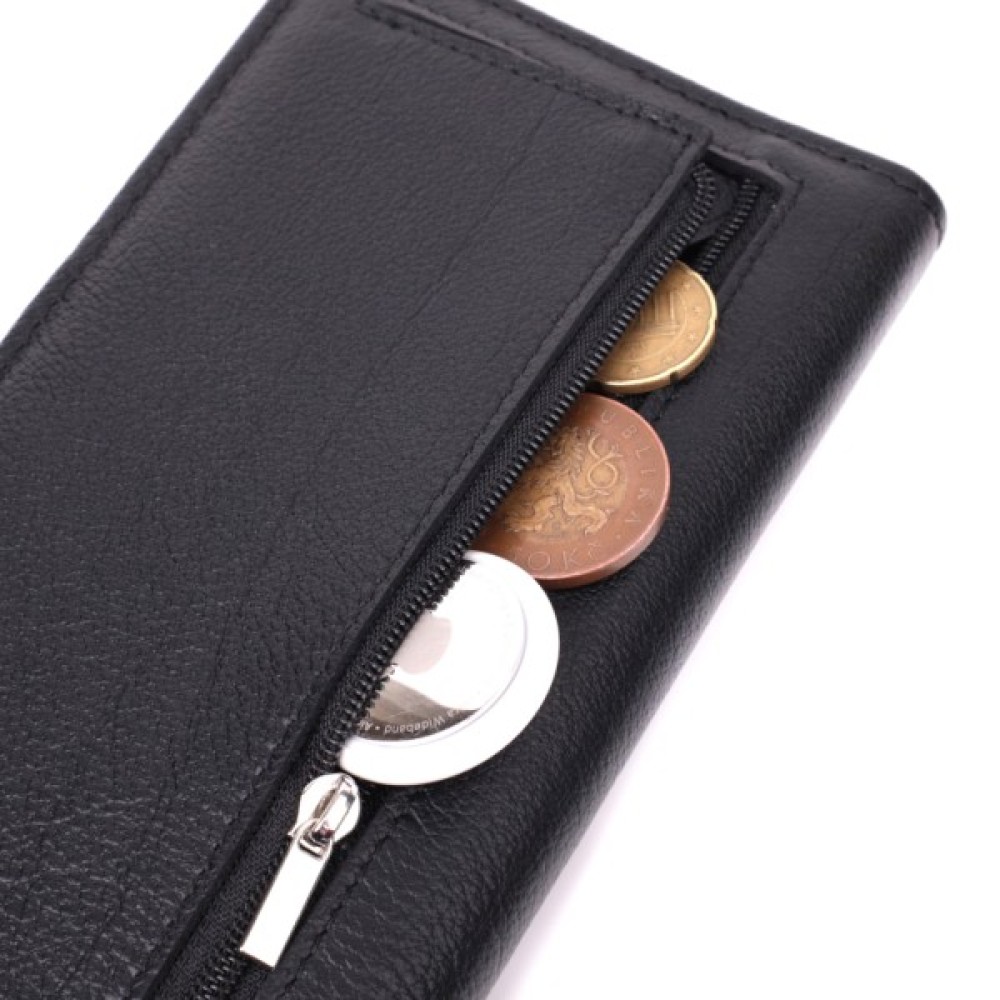 Класичний жіночий гаманець вертикального формату із натуральної добротної шкіри. Аксесуар складається з двох відділень для купюр, кишені на блискавці всередині, одинадцяти осередків для пластикових карток, двох прихованих кишень, однієї кишені під плівкою та монетниці зовні. З таким гаманцем ви проходите не один рік.