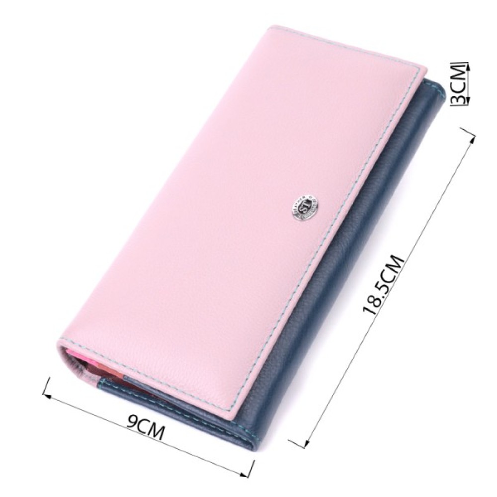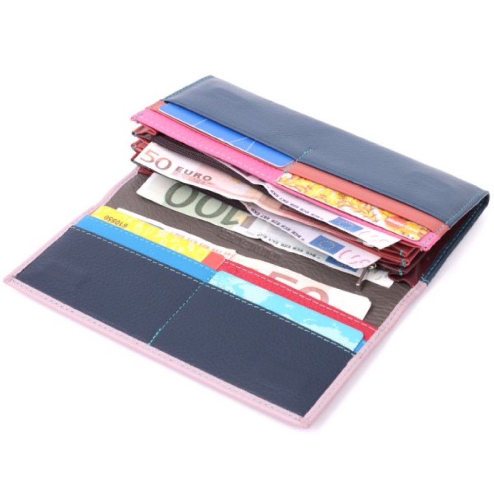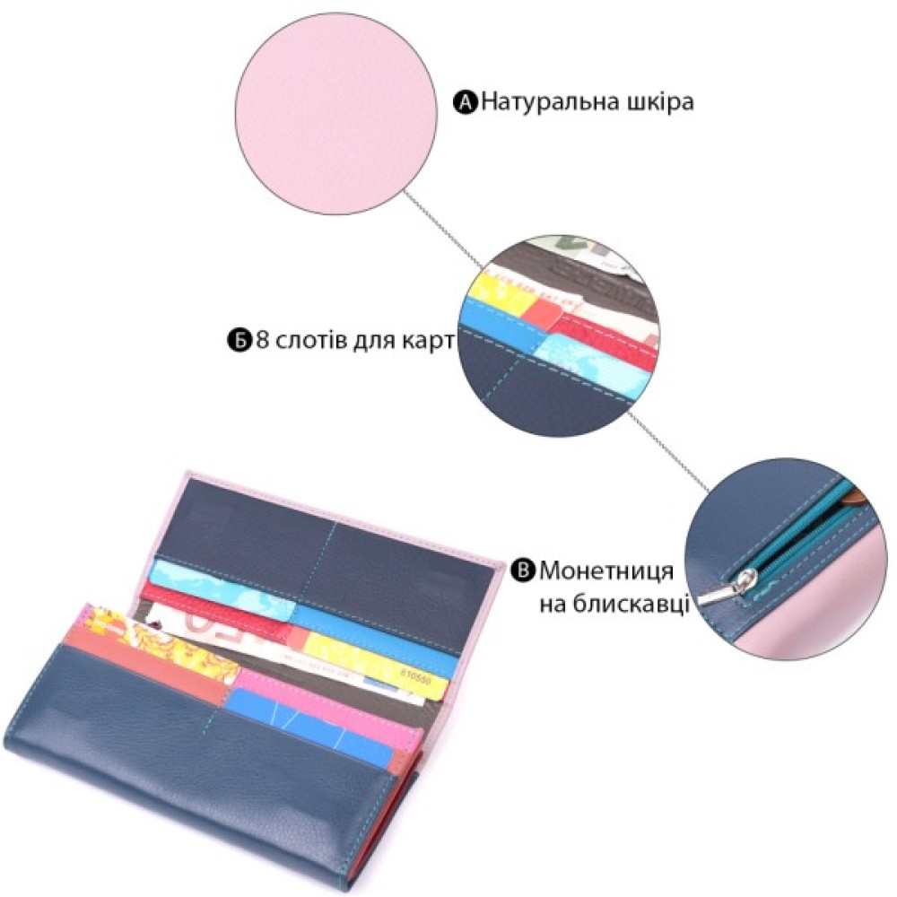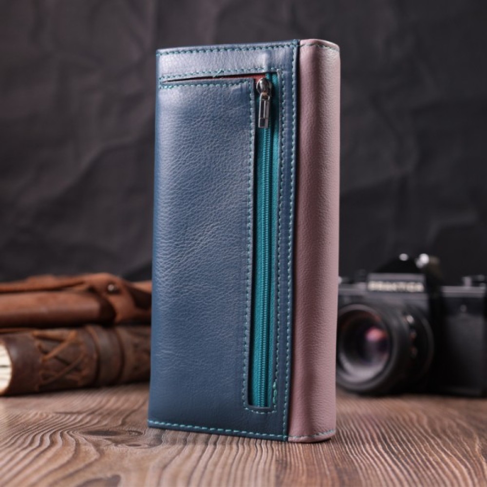 Гарне жіноче портмоне в два складення з натуральної шкіри найвищої якості. Перше, що впадає в око – це кольорове рішення, замість однотонного аксесуара ми маємо різнокольоровий, який містить два основні зовнішні кольори і кілька додаткових всередині. Шкіряне портмоне дуже практичне і служить досить довго. Аксесуар складається з чотирьох містких кишень для купюр, двох кишень на блискавках через всю довжину, восьми осередків для пластикових карток, прихованої кишені та зовнішньої кишені на блискавці, що чудово прослужить для монет. Портмоне доповнено надійною фурнітурою.