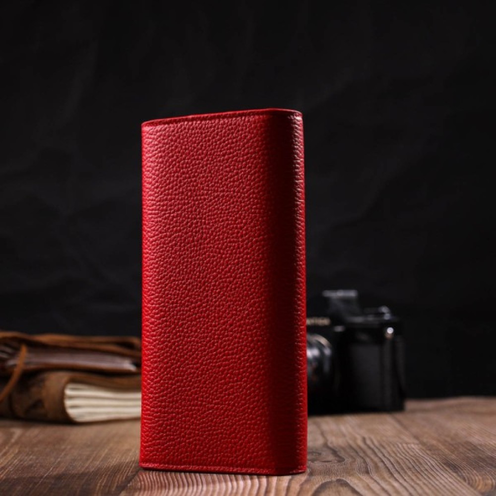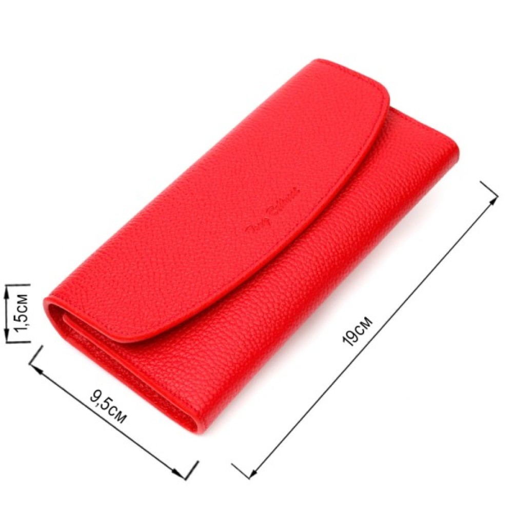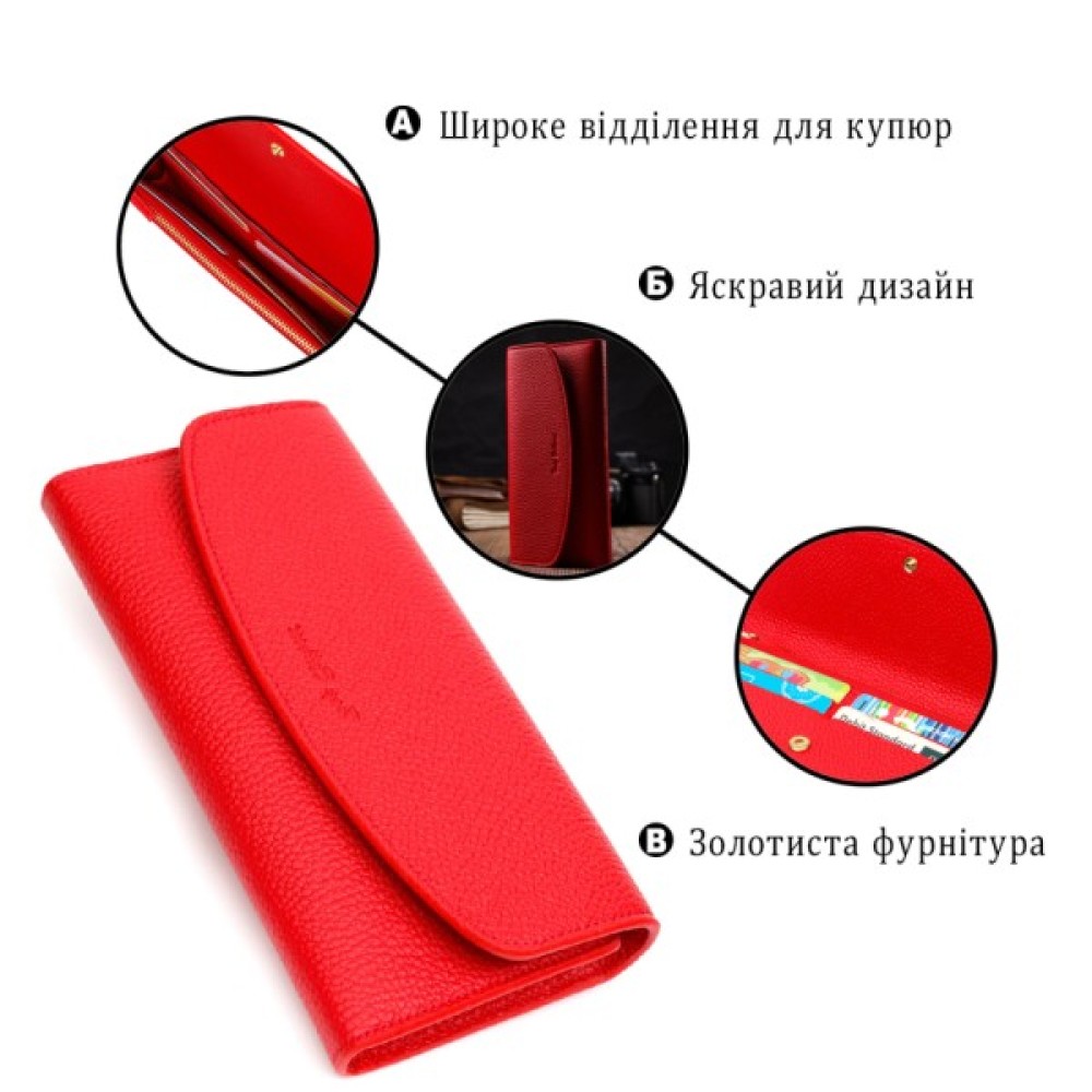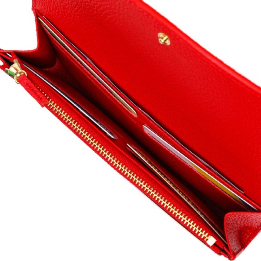Місткий жіночий гаманець з натуральної шкіри, у комбінації з двох кольорів: чорного зовні та червоного всередині. Аксесуар складається з одного широкого відділення для купюр, дванадцяти осередків для пластикових карток, однієї прилеглої кишені та монетниці на блискавці. У виробі використано якісну фурнітуру золотистого кольору. Закривається гаманець клапаном на кнопку.