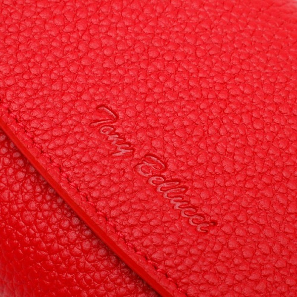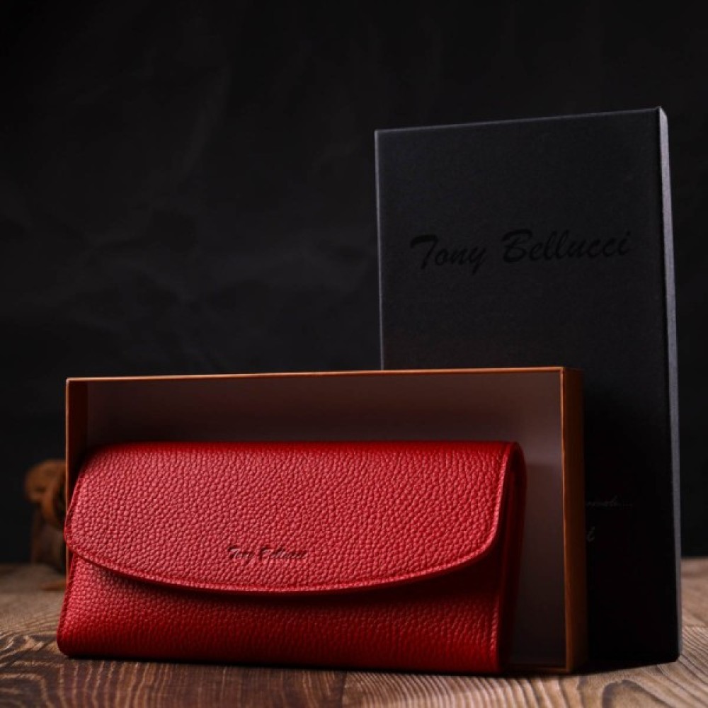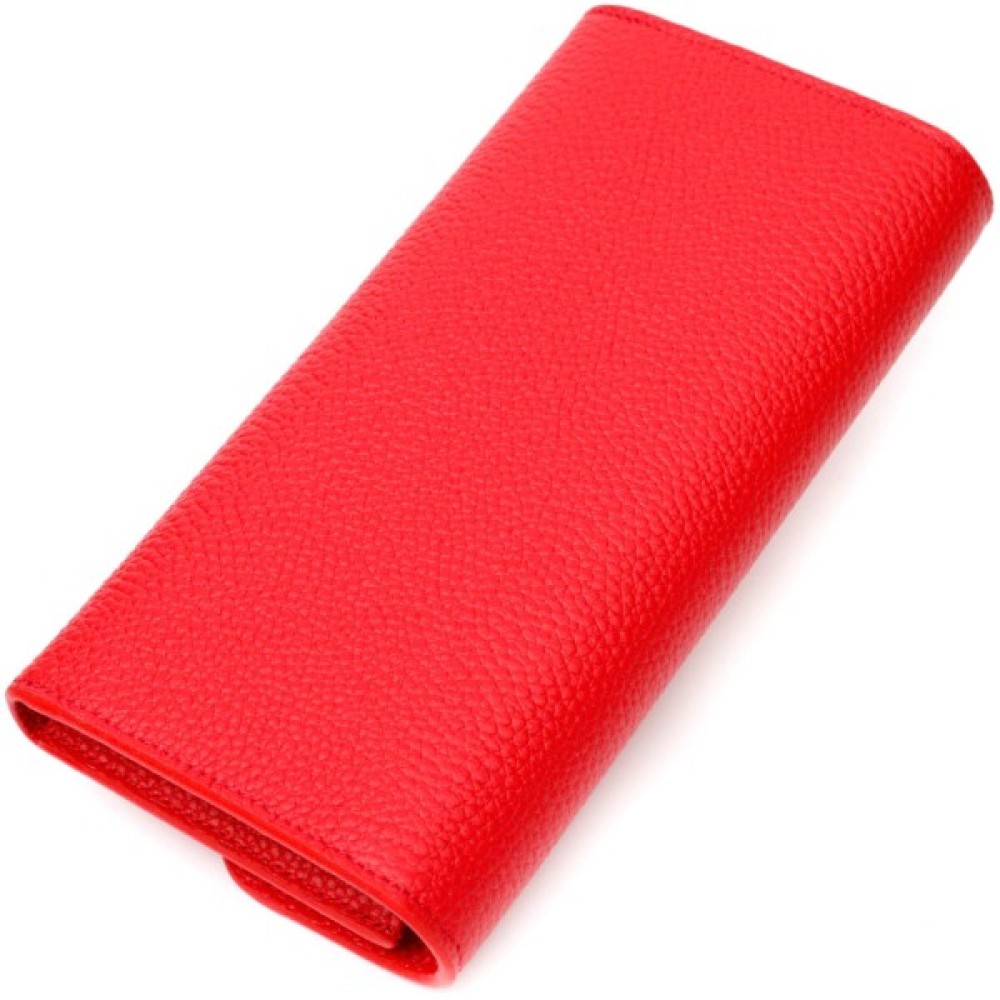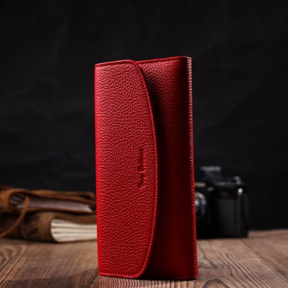 Місткий жіночий гаманець з натуральної шкіри, у комбінації з двох кольорів: чорного зовні та червоного всередині. Аксесуар складається з одного широкого відділення для купюр, дванадцяти осередків для пластикових карток, однієї прилеглої кишені та монетниці на блискавці. У виробі використано якісну фурнітуру золотистого кольору. Закривається гаманець клапаном на кнопку.