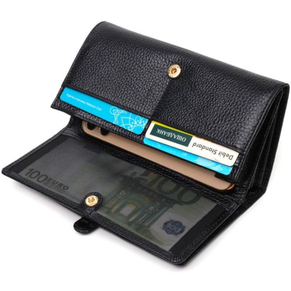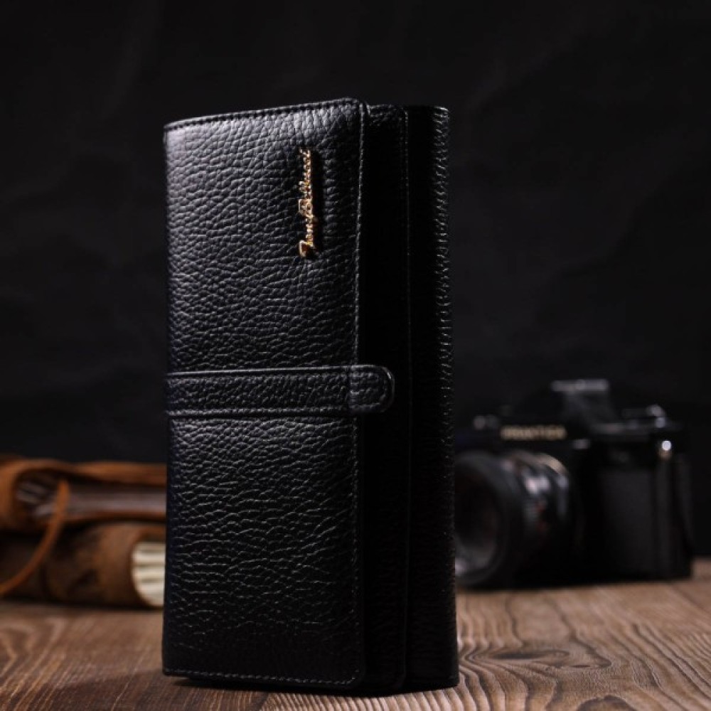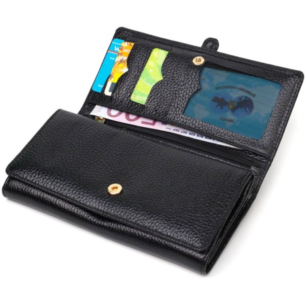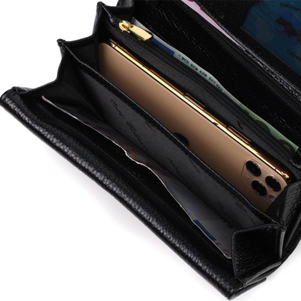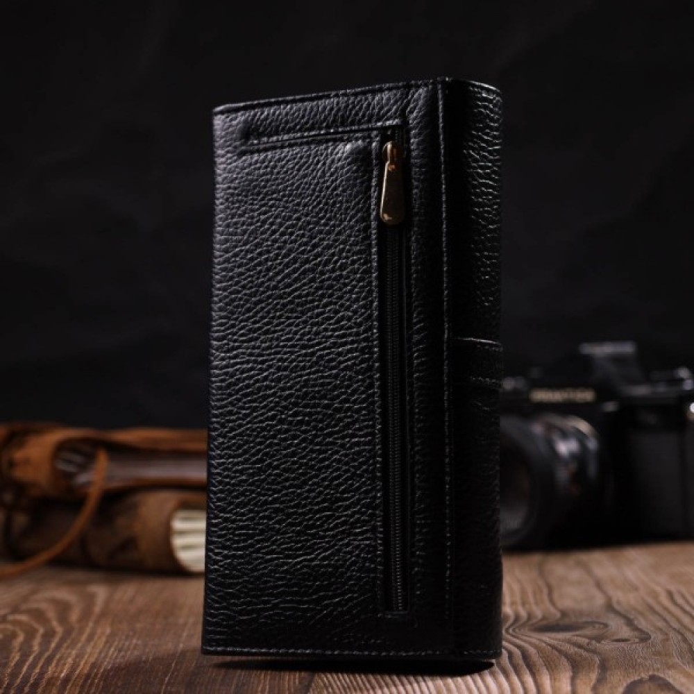 Яскравий жіночий гаманець із натуральної шкіри флотар, для якої характерна міцність, зносостійкість та зерниста фактура. Аксесуар складається з чотирьох широких відділень для купюр, одинадцяти осередків для пластикових карток, двох прилеглих кишень та трьох кишень на блискавках, які можна використовувати як монетниці. У виробі використано якісну фурнітуру золотистого кольору. Закривається гаманець клапаном на кнопку.