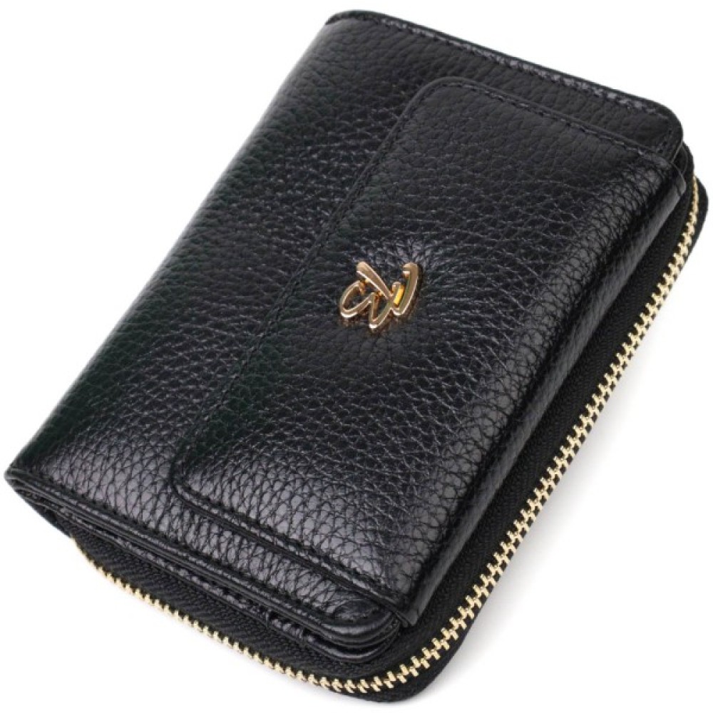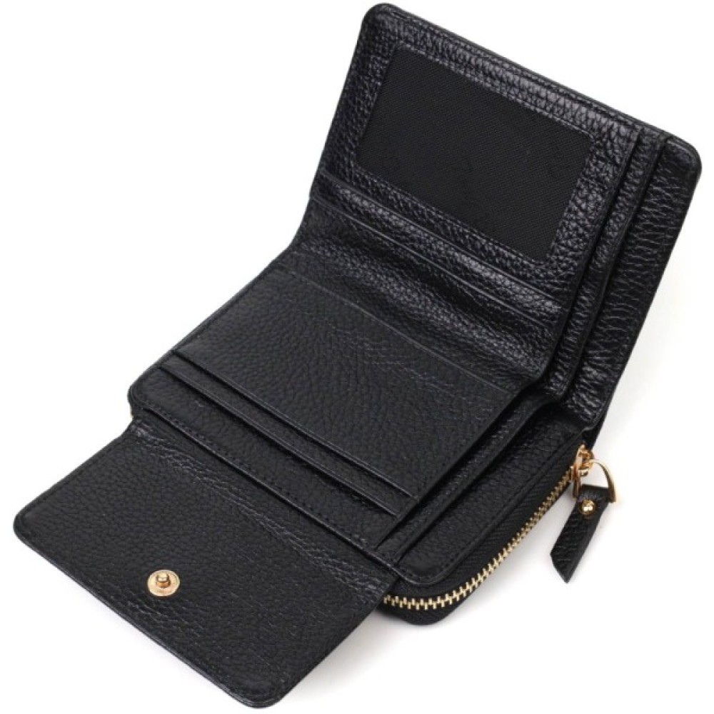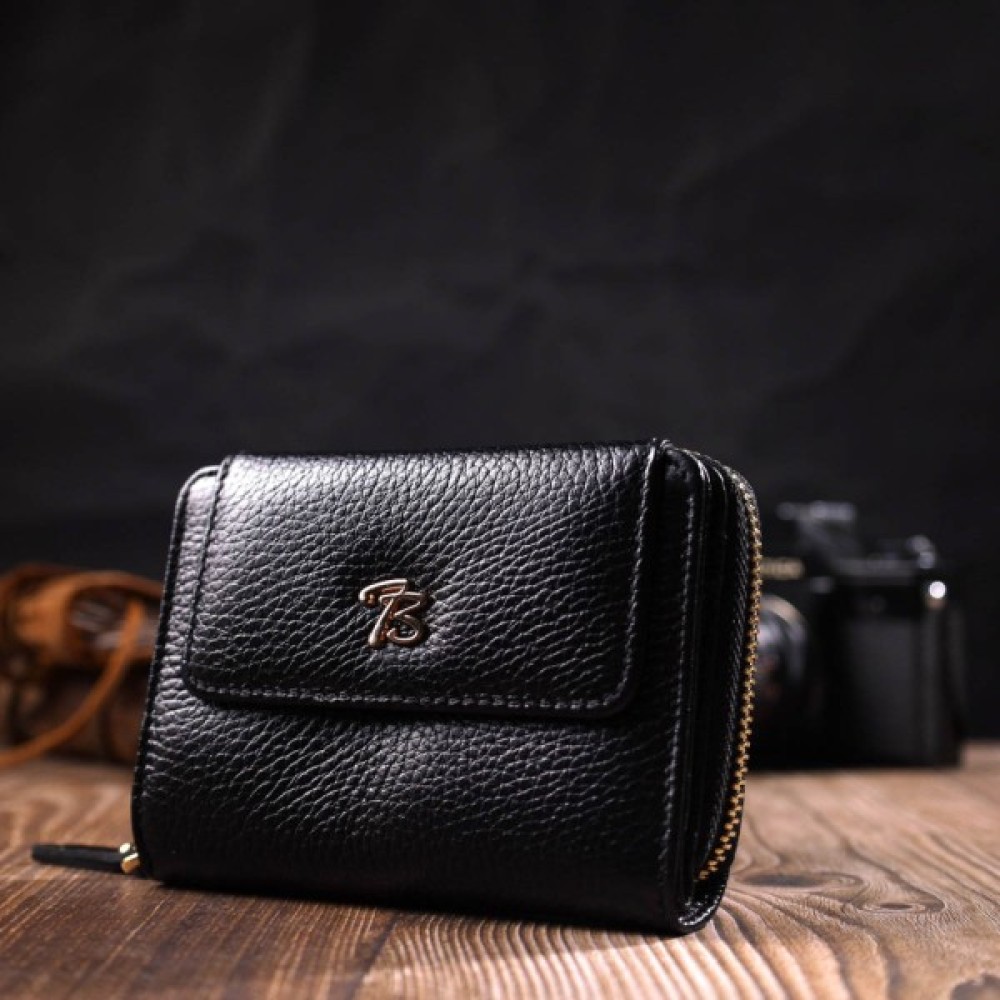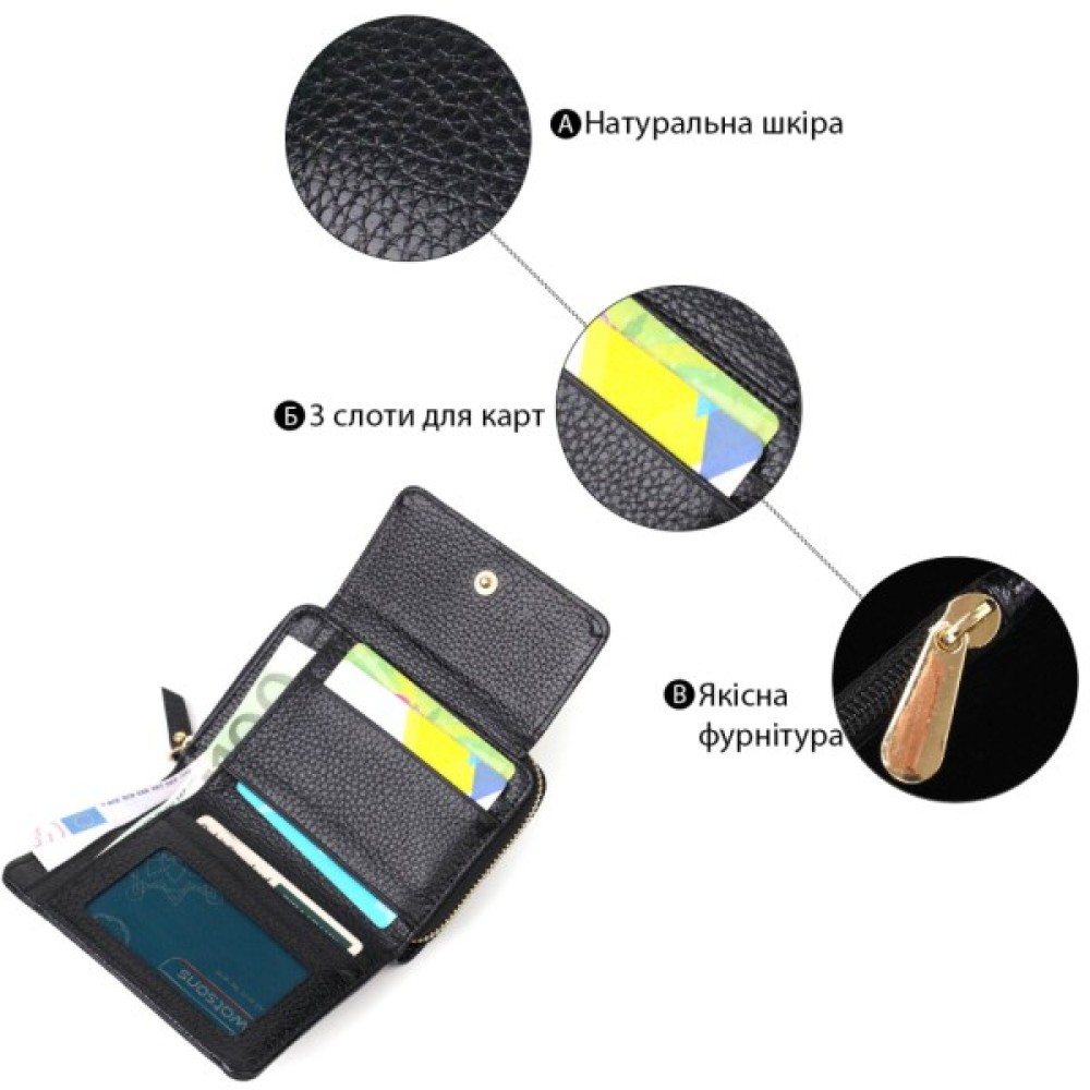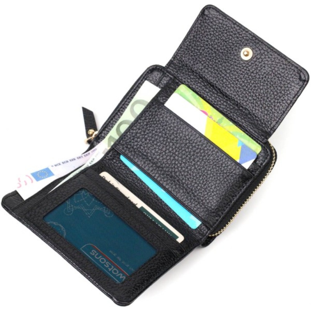 Зручний жіночий гаманець із натуральної шкіри. Аксесуар складається з двох широких відділень для купюр, трьох осередків для пластикових карток, двох прилеглих кишень та монетниці на блискавці, з кишенею-перегородкою на змійці. У виробі використано якісну фурнітуру золотистого кольору. Закривається гаманець клапаном на кнопку. На клапані всередині золотистий логотип компанії виробника.