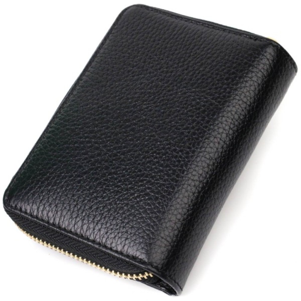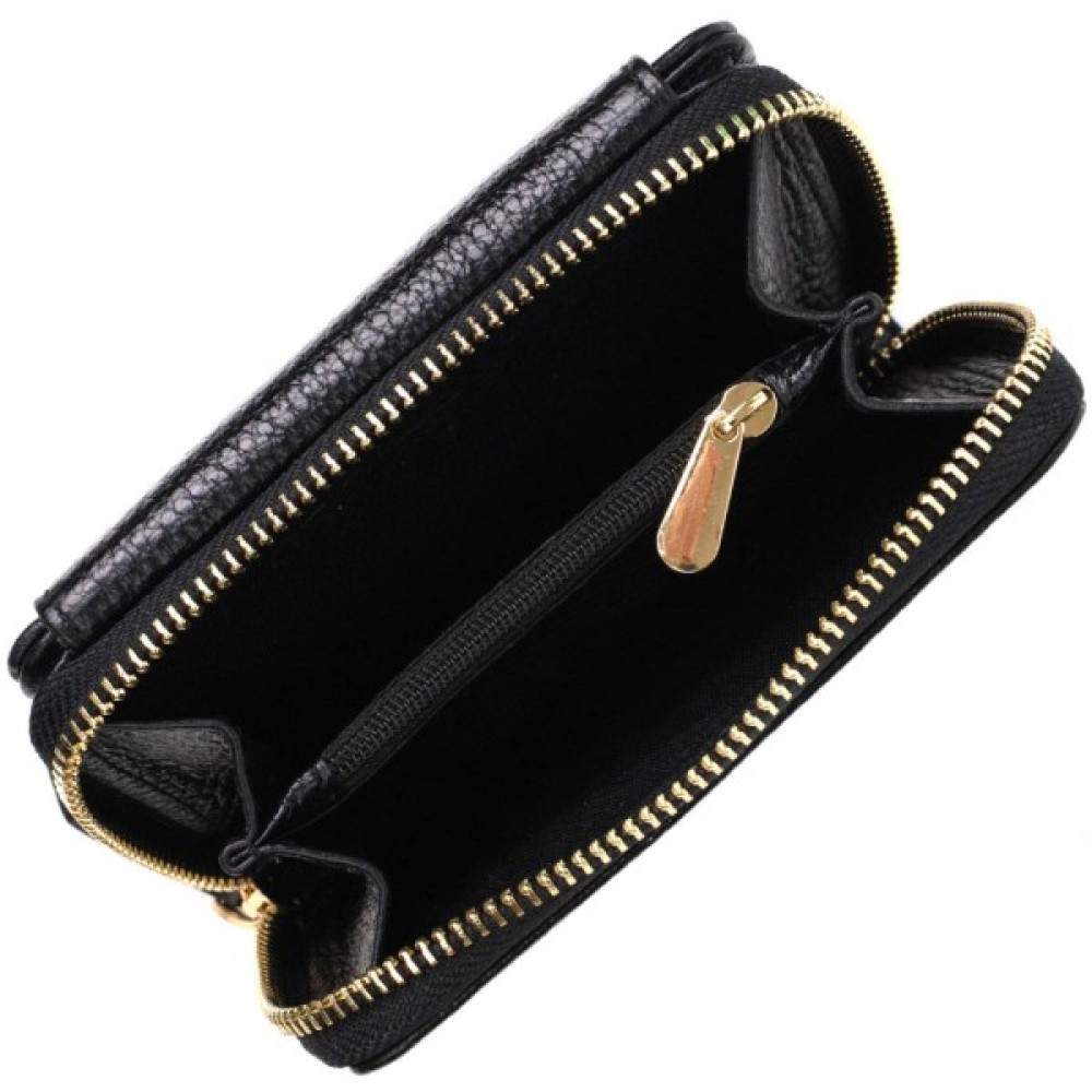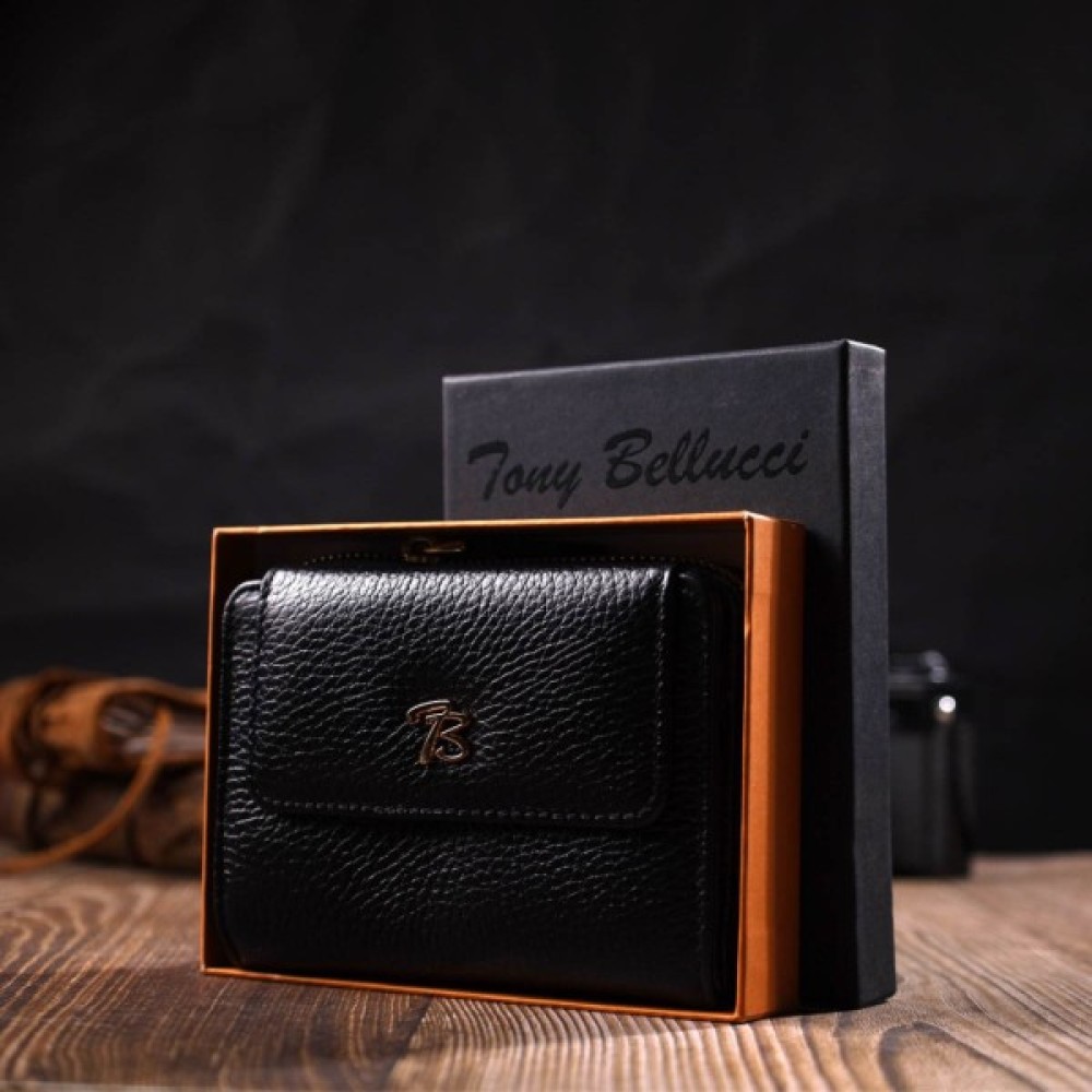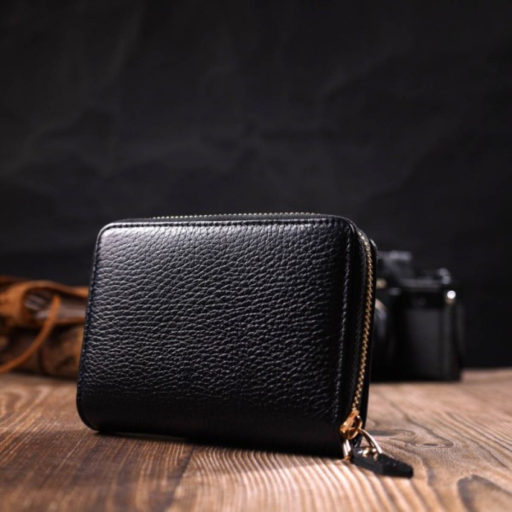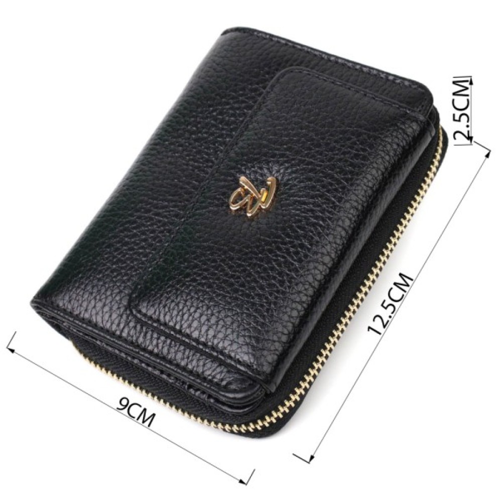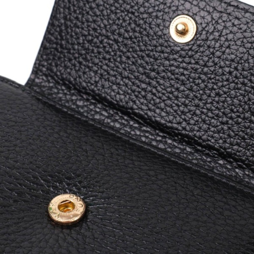 Зручний жіночий гаманець із натуральної шкіри. Аксесуар складається з двох широких відділень для купюр, трьох осередків для пластикових карток, двох прилеглих кишень та монетниці на блискавці, з кишенею-перегородкою на змійці. У виробі використано якісну фурнітуру золотистого кольору. Закривається гаманець клапаном на кнопку. На клапані всередині золотистий логотип компанії виробника.