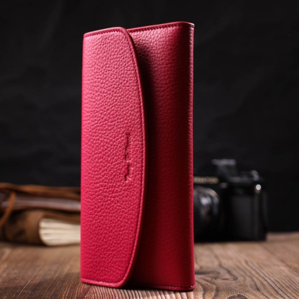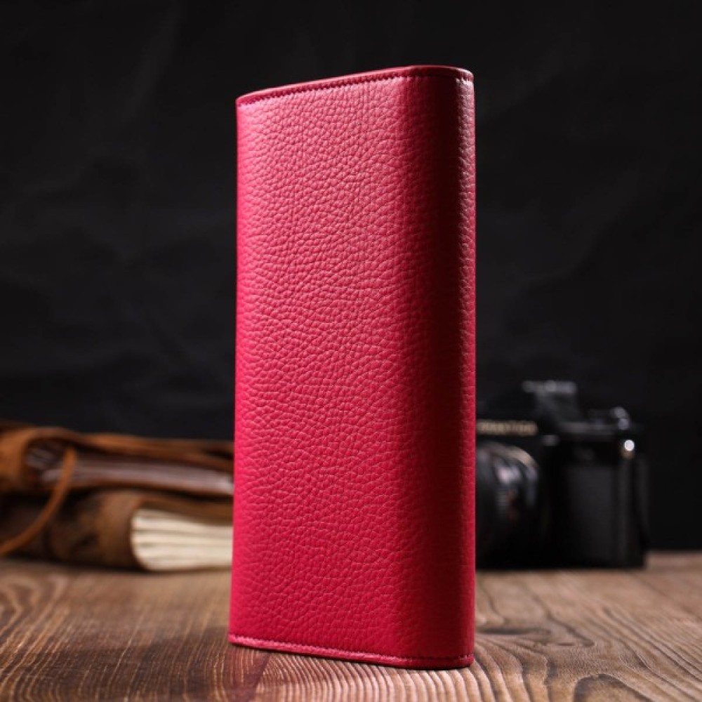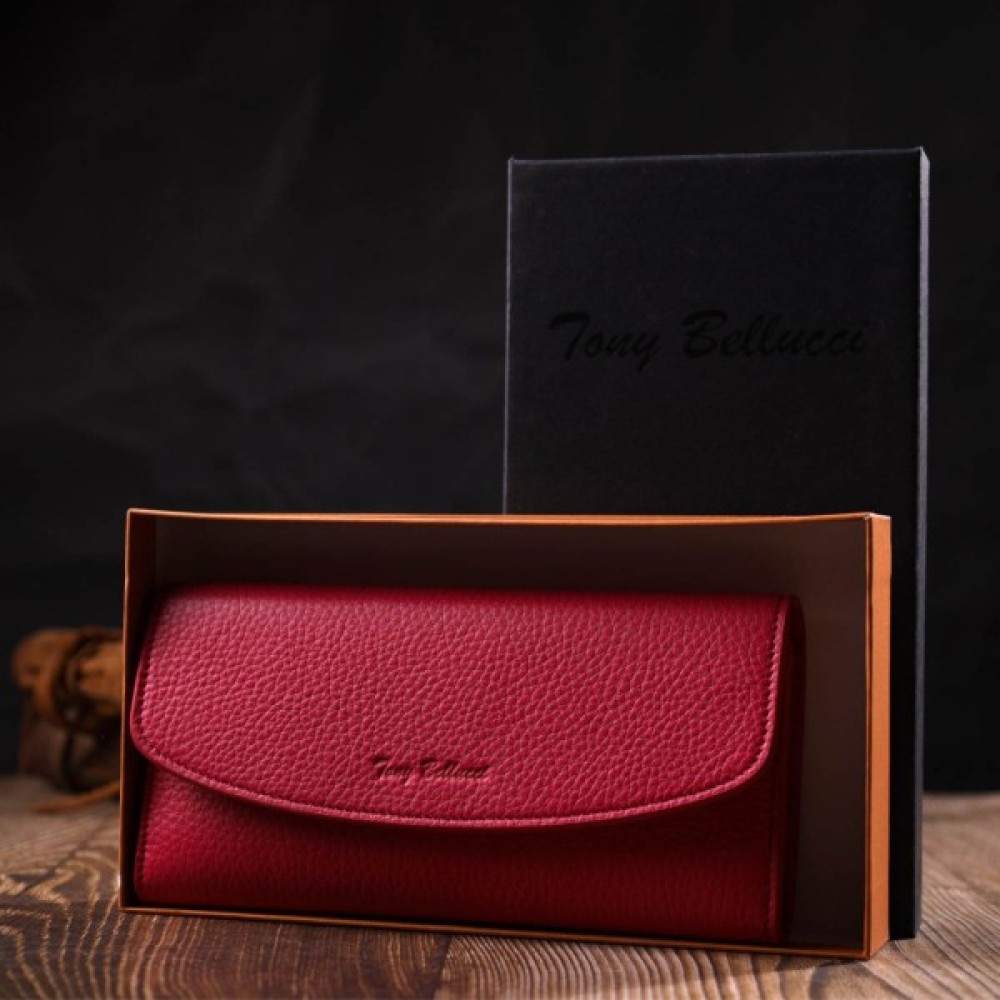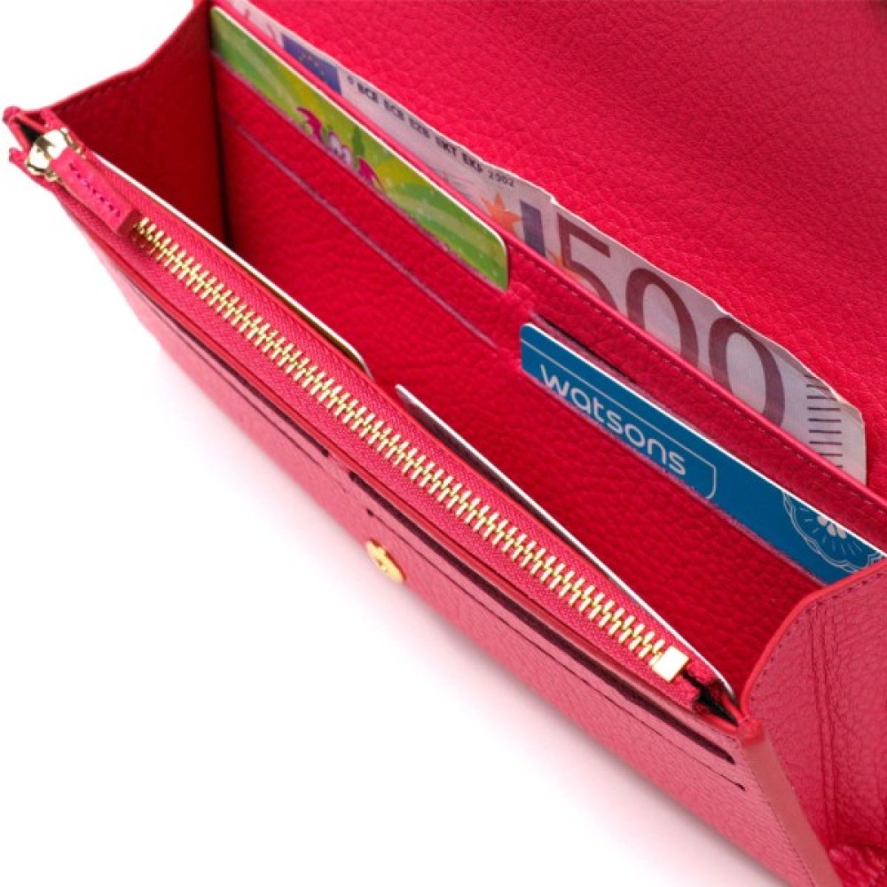 Місткий жіночий гаманець з натуральної шкіри, у комбінації з двох кольорів: чорного зовні та червоного всередині. Аксесуар складається з одного широкого відділення для купюр, дванадцяти осередків для пластикових карток, однієї прилеглої кишені та монетниці на блискавці. У виробі використано якісну фурнітуру золотистого кольору. Закривається гаманець клапаном на кнопку.