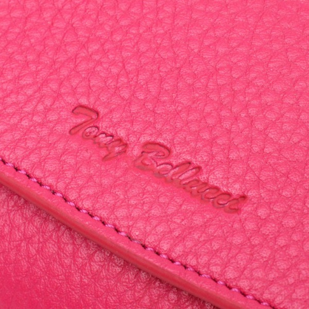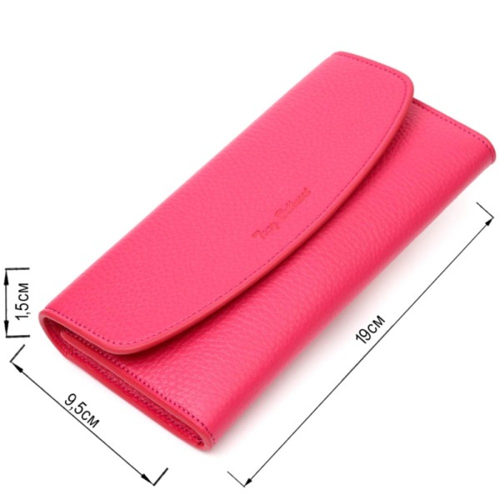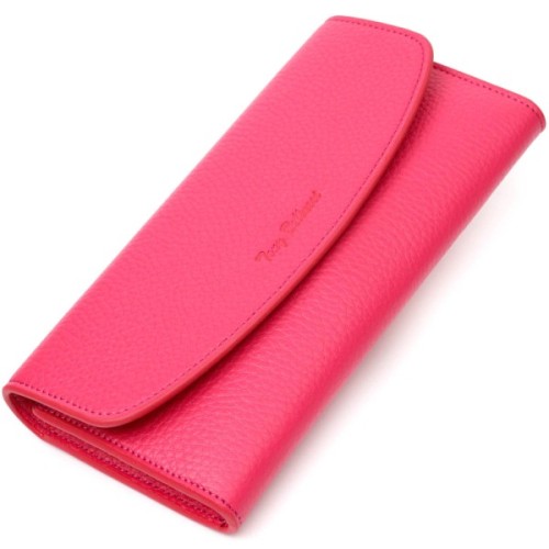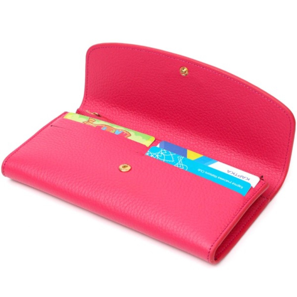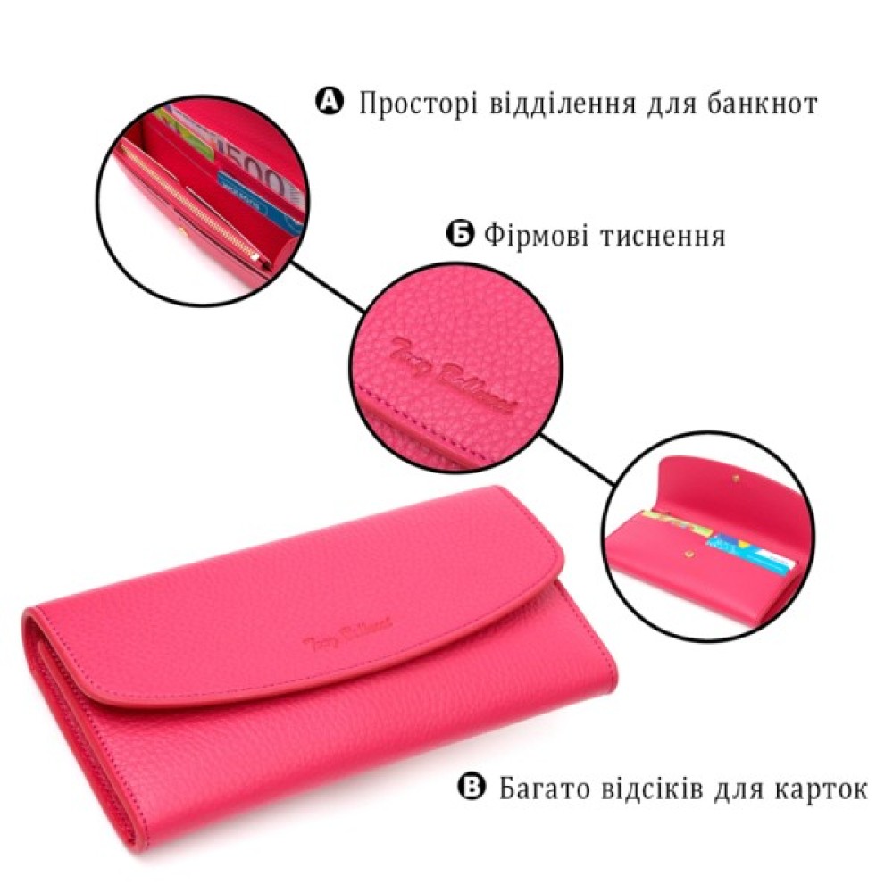 Місткий жіночий гаманець з натуральної шкіри, у комбінації з двох кольорів: чорного зовні та червоного всередині. Аксесуар складається з одного широкого відділення для купюр, дванадцяти осередків для пластикових карток, однієї прилеглої кишені та монетниці на блискавці. У виробі використано якісну фурнітуру золотистого кольору. Закривається гаманець клапаном на кнопку.