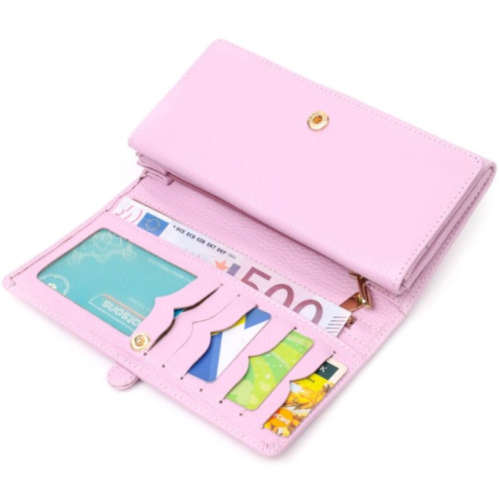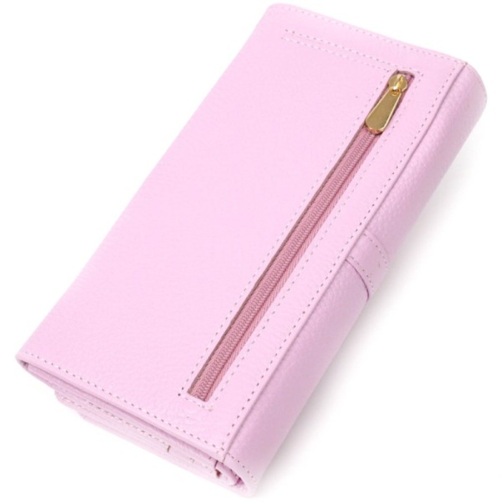 Яскравий жіночий гаманець із натуральної шкіри флотар, для якої характерна міцність, зносостійкість та зерниста фактура. Аксесуар складається з чотирьох широких відділень для купюр, одинадцяти осередків для пластикових карток, двох прилеглих кишень та трьох кишень на блискавках, які можна використовувати як монетниці. У виробі використано якісну фурнітуру золотистого кольору. Закривається гаманець клапаном на кнопку.
