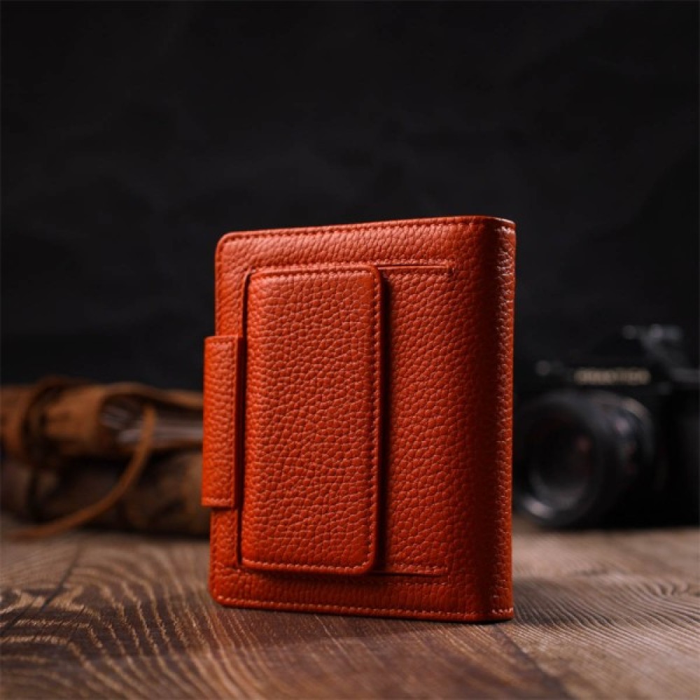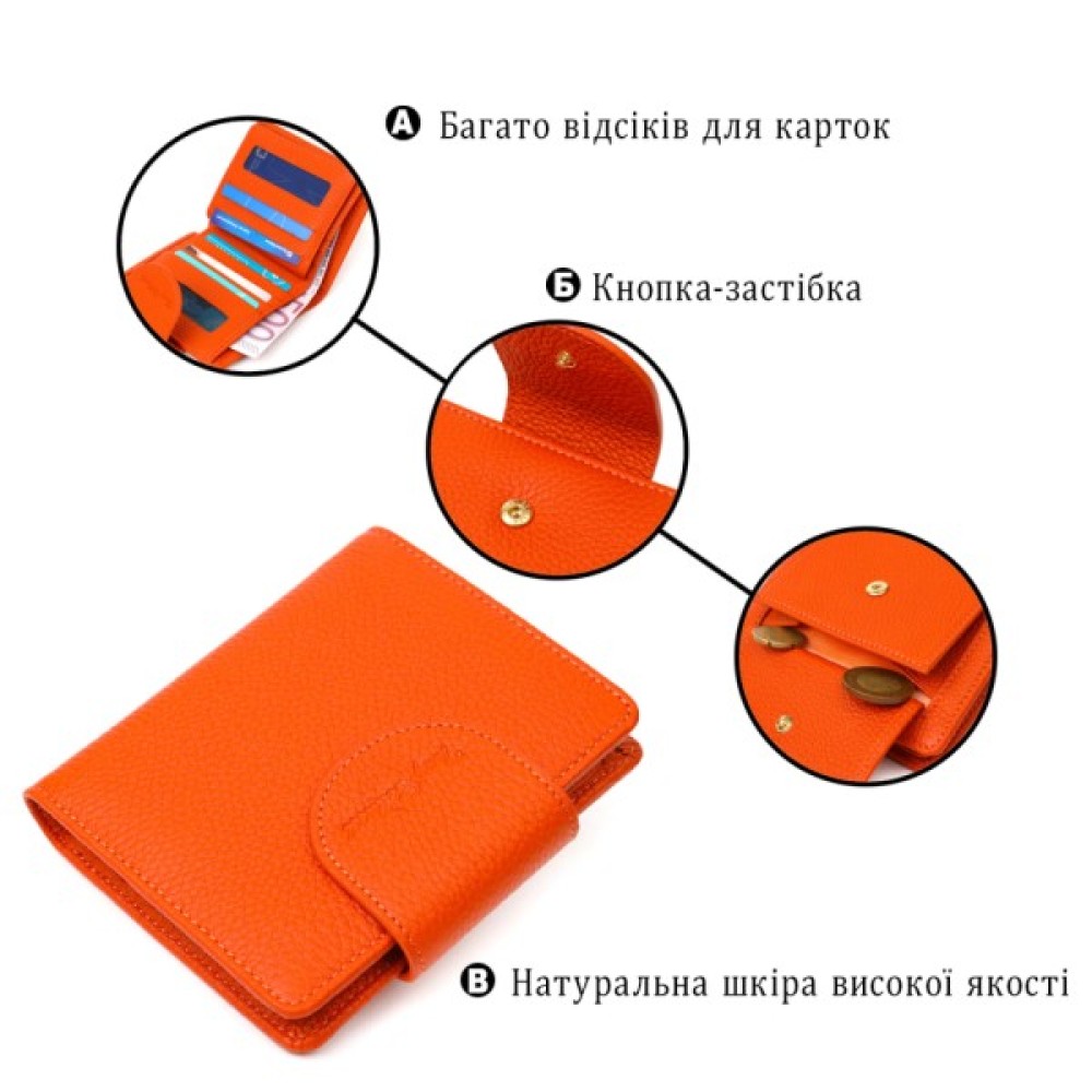 Зручний місткий жіночий гаманець із натуральної шкіри. Аксесуар складається з двох широких відділень для купюр, дев'яти осередків для пластикових карток, двох прилеглих кишень, кишені під сіточкою та монетниці під клапаном зовні. У виробі використано якісну фурнітуру золотистого кольору. Закривається гаманець шкіряним хлястиком на кнопку. Купуючи цей шкіряний гаманець, Ви не тільки набуваєте стильну річ, але й отримуєте якісний аксесуар, який прослужить не один рік.
