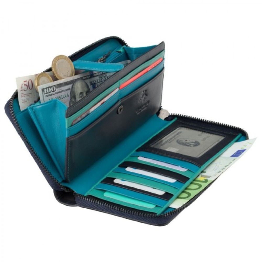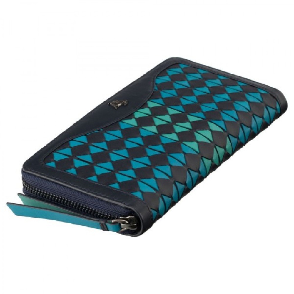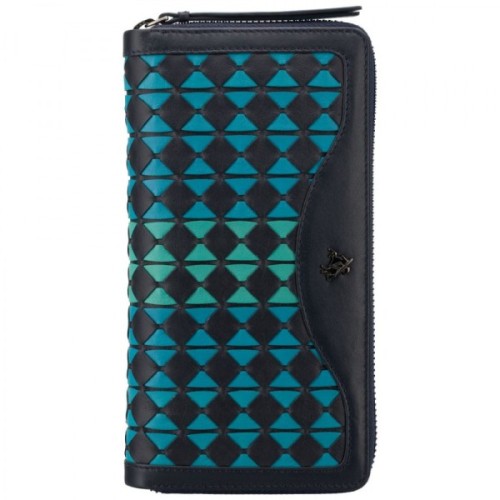 Основне відділення закривається на металеву блискавку, собачка якої із зручним та великим шкіряним хлястиком. Усередині дві секції: перша відкрита під картки, друга, на клямці з кнопкою - під купюри. Відділення купюр умовно поділено на три секції, середнє з яких закривається також на блискавку. З тильного боку гаманця є плоска кишеня на блискавці під дріб'язок.Характеристики