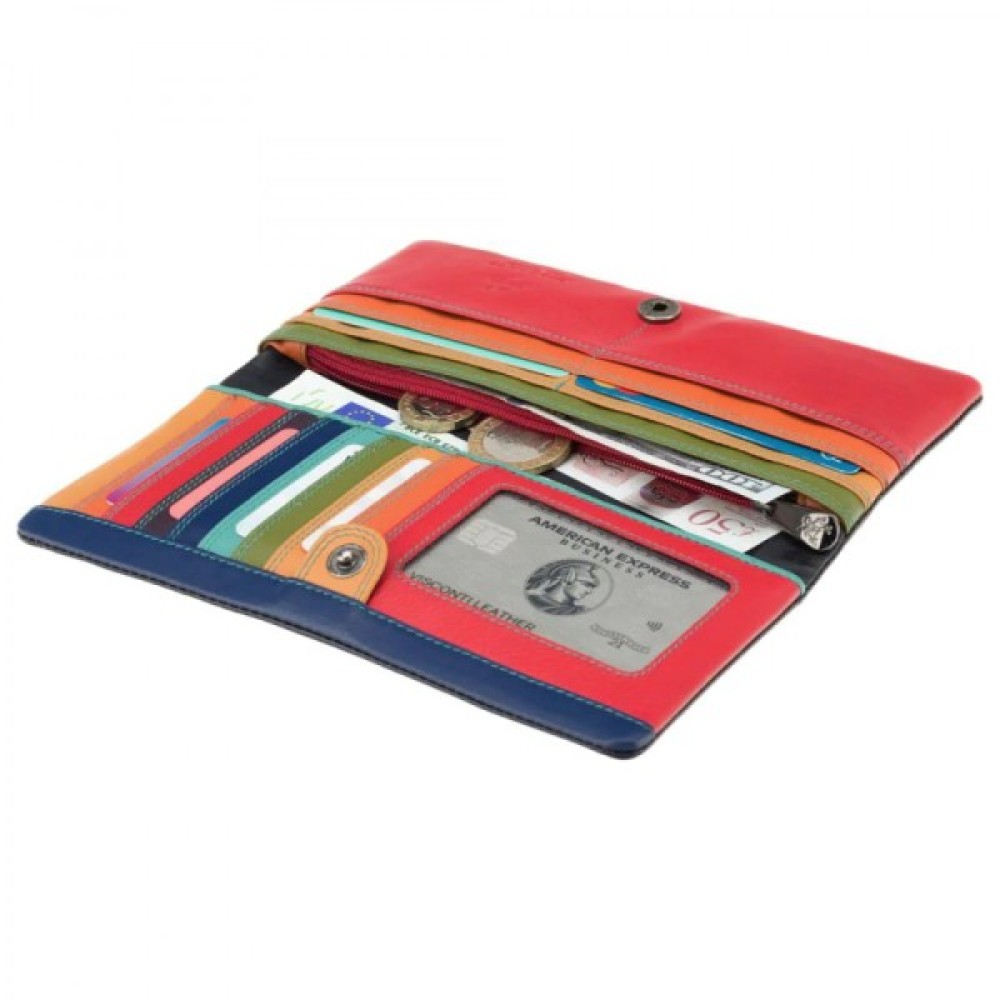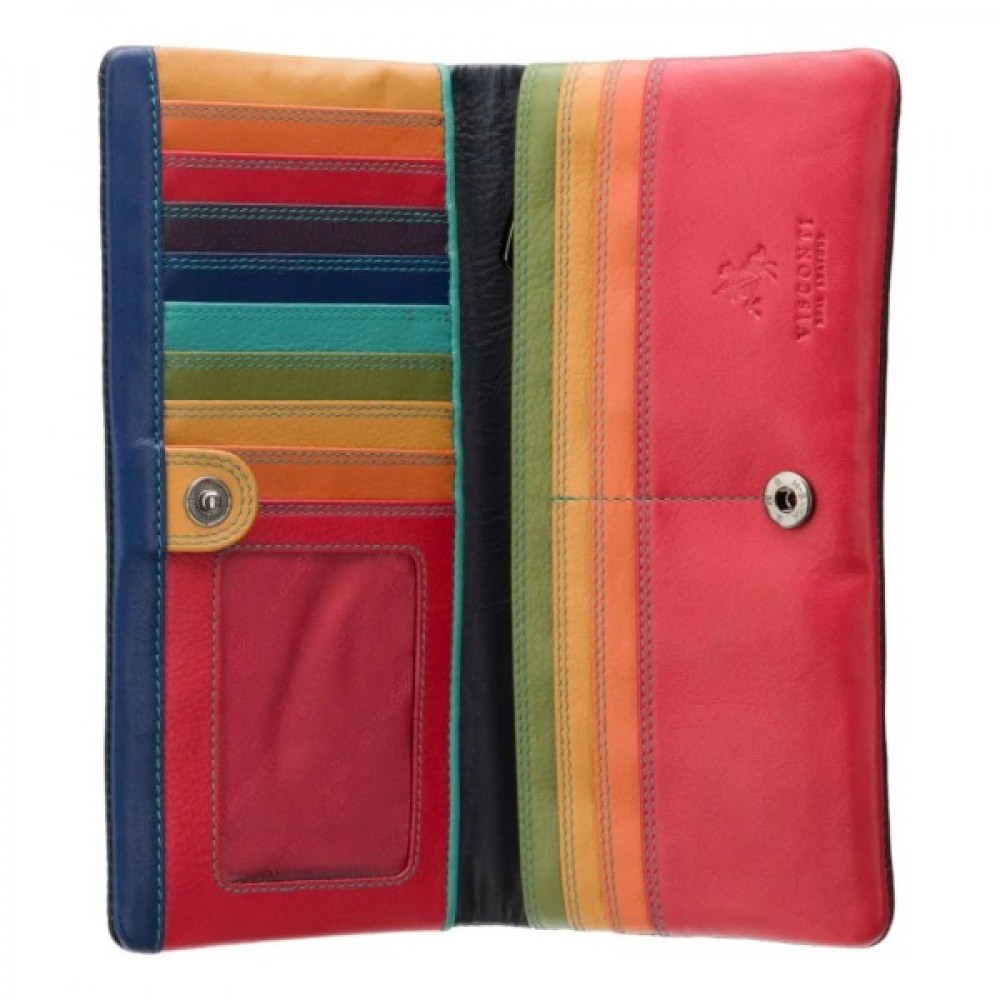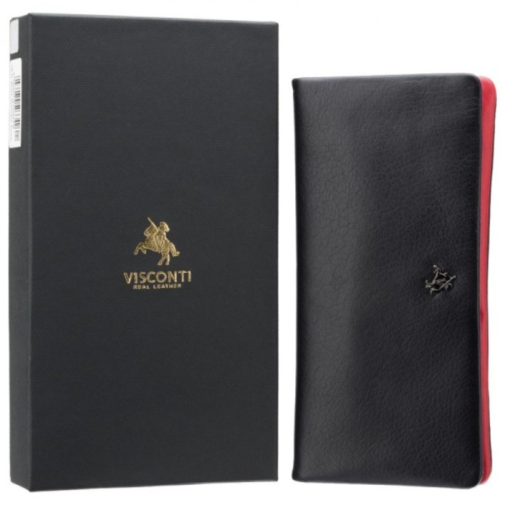Жіночий чорний гаманець Visconti CM70 у два складанні з застібкою на кнопці та яскравим забарвленням усередині. Велика кількість відділів, округлі безшовні краї та м'яка шкіра не залишить байдужою жодноїї її власниці, не даремно над колекцією так довго трудились дизайнери.