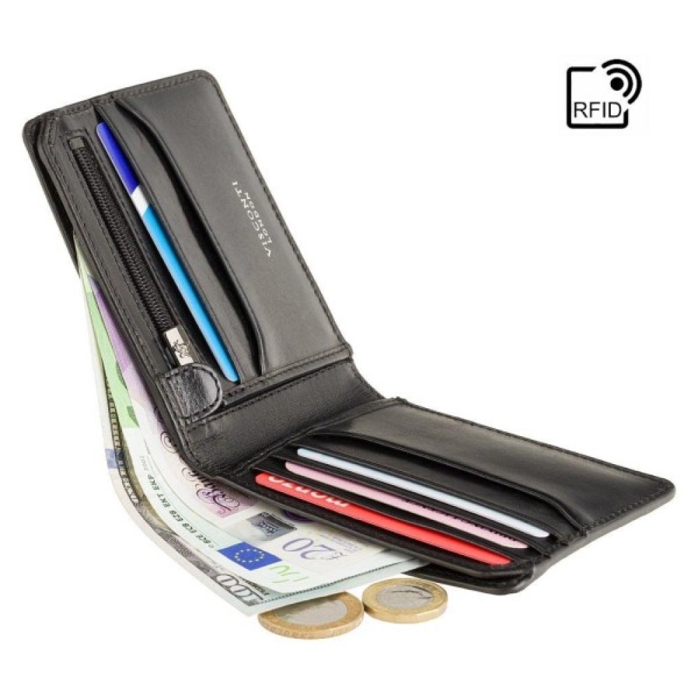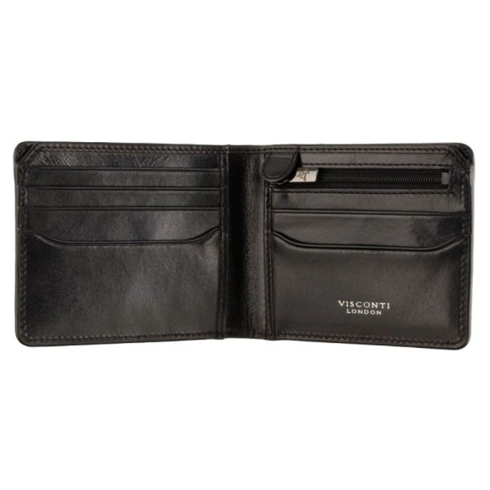 Шкіряний портмоне у класичному чорному кольорі від Visconti — виріб англійського бренду, який створює якісні вироби на довгі роки та має RFID-захист для зчитування даних з карток. Виконаний з гладкої шкіри