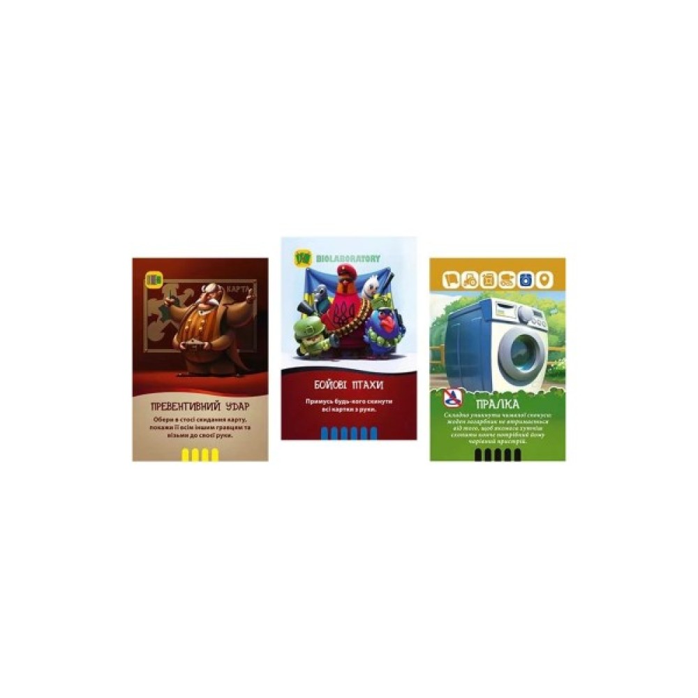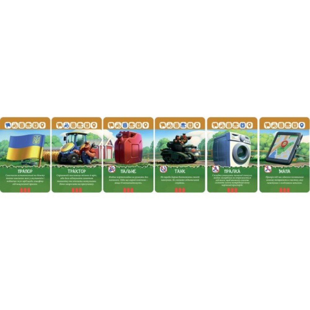 Ви будете збирати сет із шести сюжетних карток: Прапор, Трактор, Пальне, Танк, Пралка і Мапа, використовуючи 64 карти, які додають динаміки та несподіваних поворотів. Гра починається з роздачі по 3 картки кожному, а далі кожен хід включає розігрування карток дій, викладання карток у сет та добирання до 3 карток. Ваше завдання — вилучити зайві картки і заблокувати дії суперника, але пам’ятайте, що дві однакові дії під час одного ходу використовувати не можна!