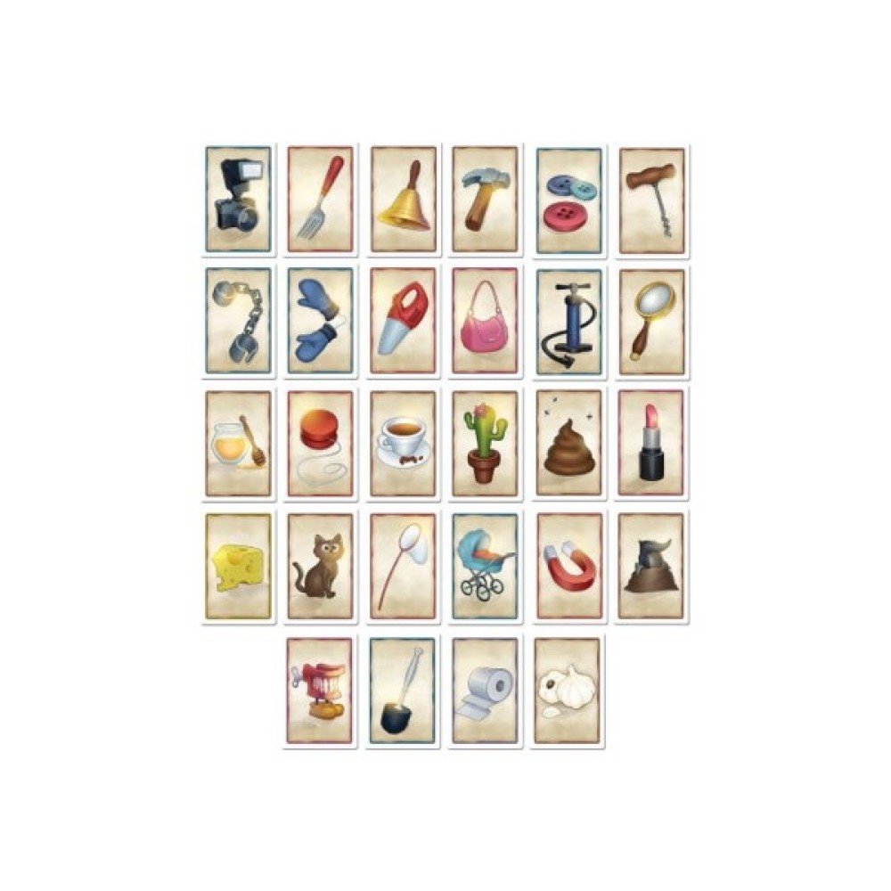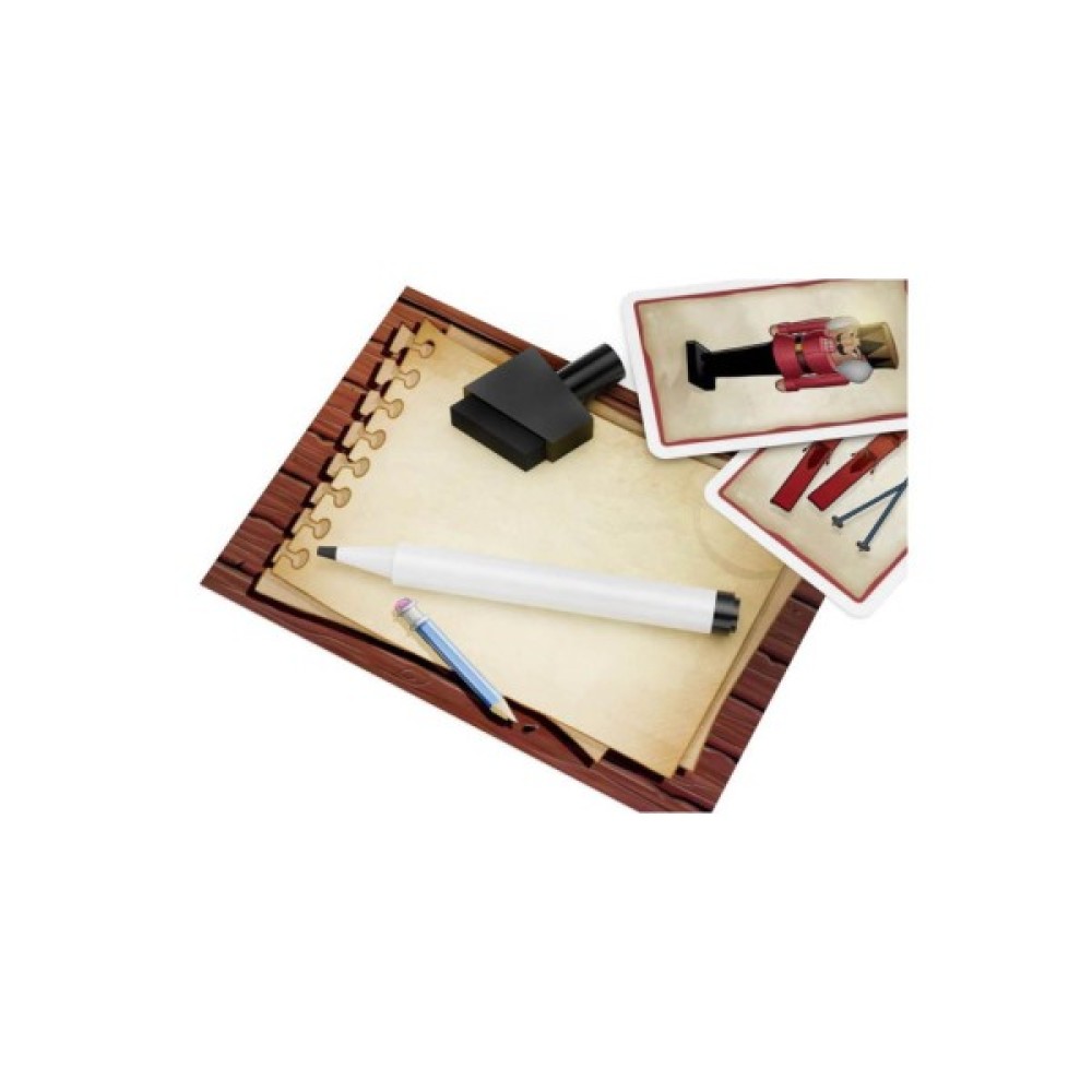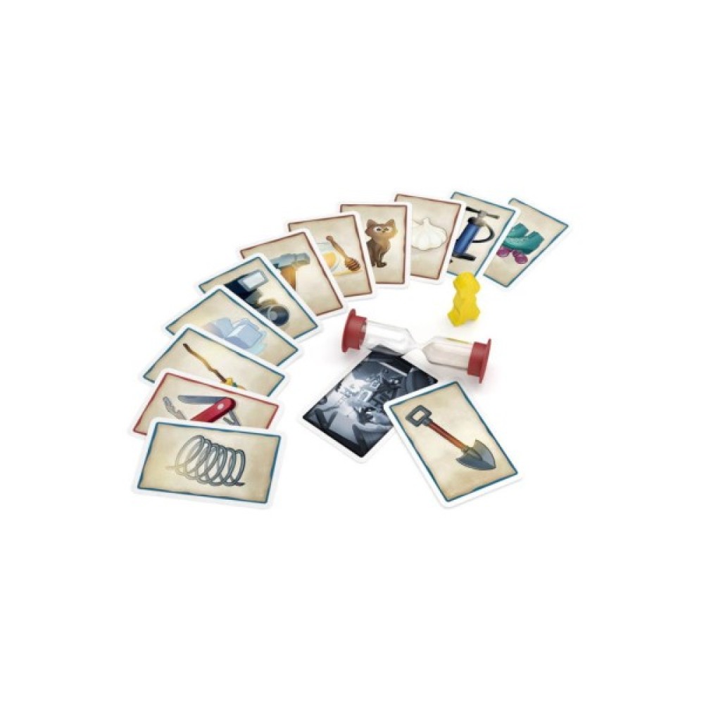 110 карток предметів, книга пригод, ігрове поле, 3 жетони відповідей, планшет для записів та маркер, фігурка шукача пригод, пісковий годинник, правила гри