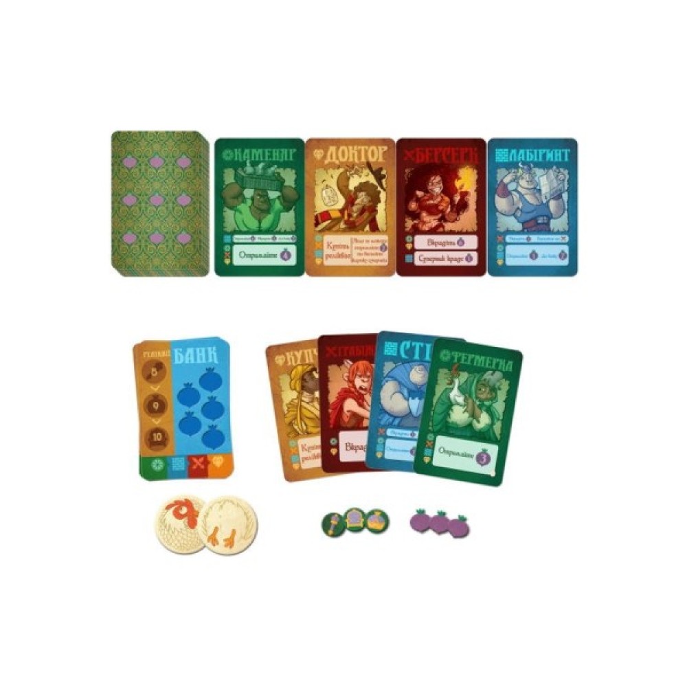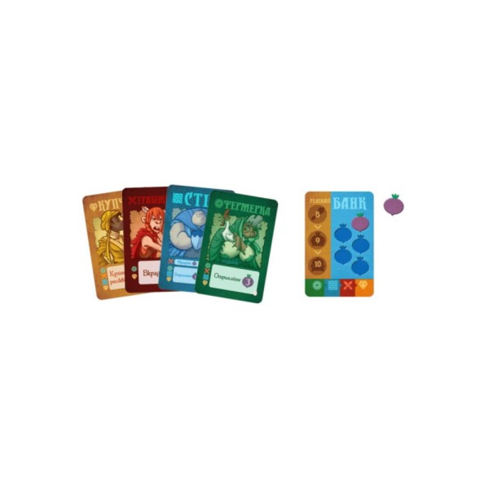 У комплектацію входять 54 картки: 24 початкових карти, 24 ринкових та 6 банківських; 91 жетон, включаючи 72 ріпи та 18 реліквій, а також унікальний жетон — курка для жеребкування. Відчуйте напругу кожного раунду, обдумуючи тактику і розігруючи карти фермерів, стіни, грабіжників та купців, щоб захистити своє село і здобути ресурси.