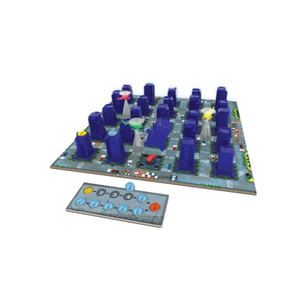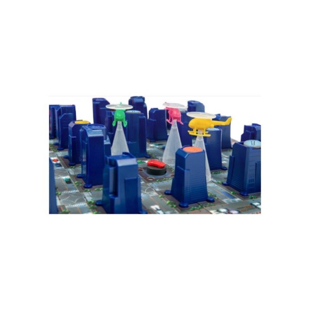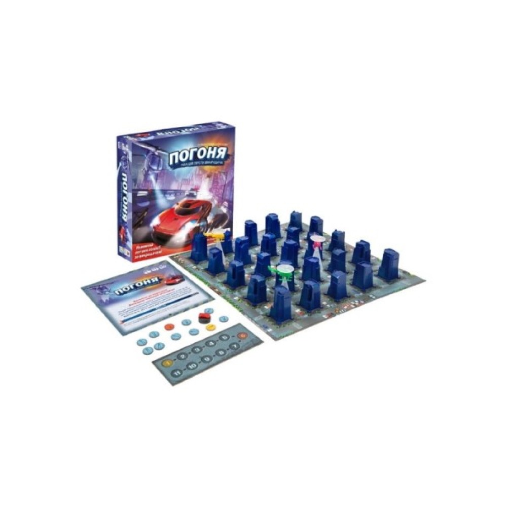 Комплектація гри вражає багатством: ви знайдете тут ігрове поле, 25 будівель, 11 жетонів слідів, планшет раундів, а також детально продумані гелікоптери та машину з правилами гри, що забезпечують реалістичний ігровий досвід. Стратегічно плануючи свої рухи та координацію, команда поліції прагне виявити сліди викрадача, що тренує логічне мислення.