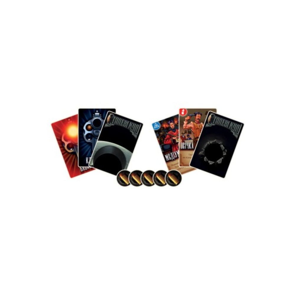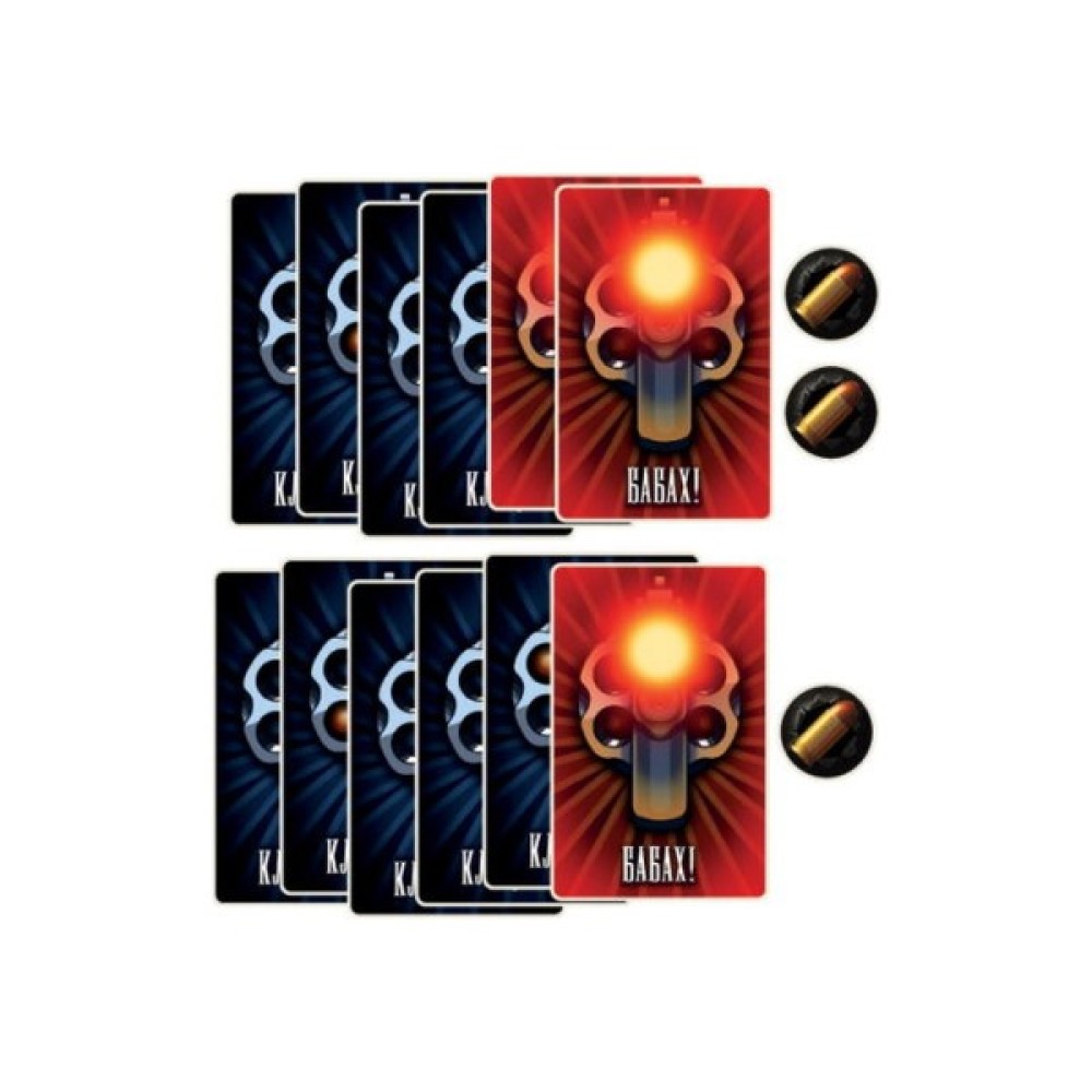 Комплектація гри вражає своєю різноманітністю: 10 карт револьвера, 27 карт ситуацій, 5 жетонів патронів та детальні правила, що легко пояснюють всі нюанси. Гра проводиться українською мовою, що сприяє легкому розумінню та природній комунікації між учасниками.