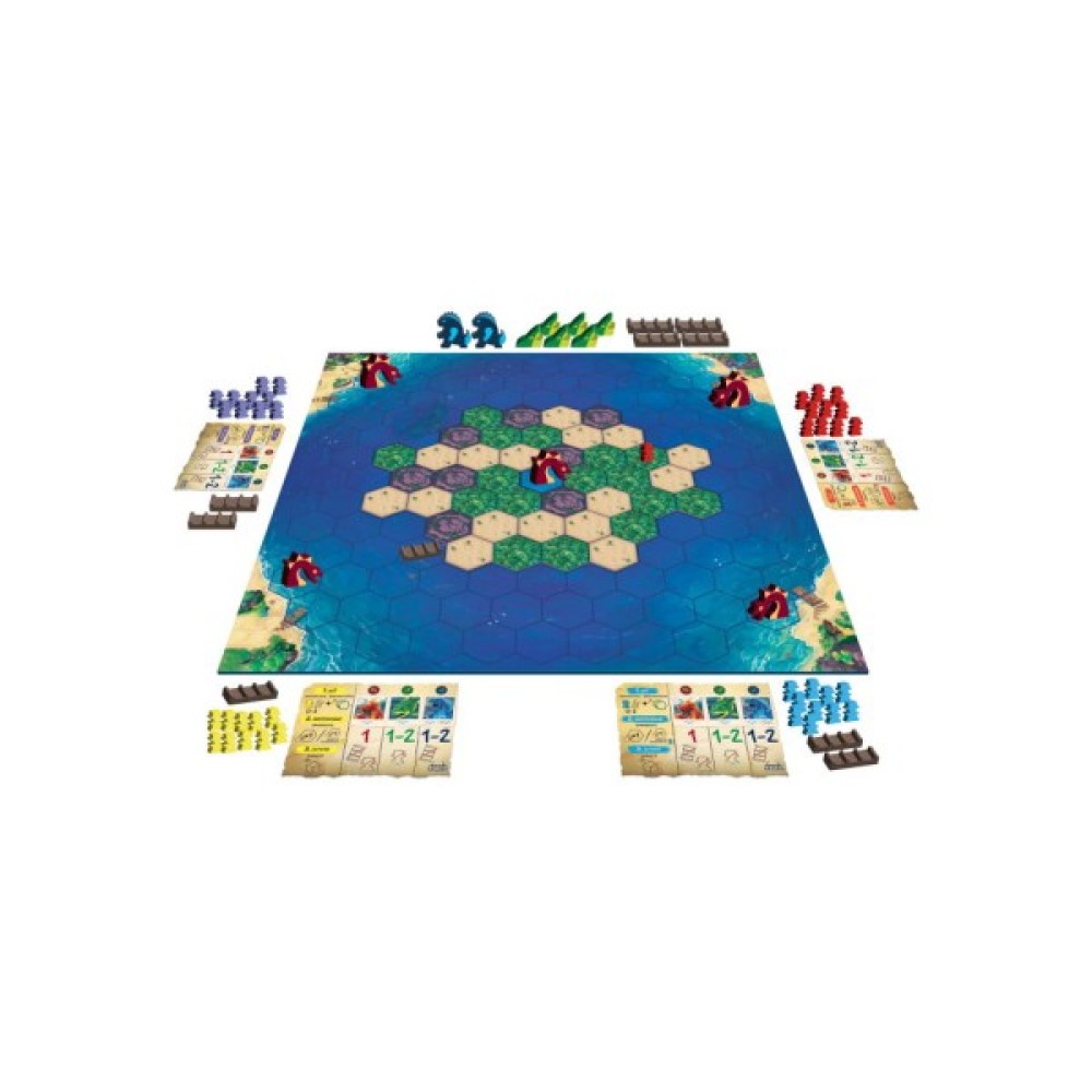 ігрове поле; 50 фішок шукачів пригод (по 10 кожного кольору) з числами скарбів 1, 2, 3, 4, 5; 40 плиток острова: 16 пляжів, 16 лісів та 8 гір; 13 фішок істот (5 морських зміїв, 6 акул, 2 кайджю); 12 плотів, кожен з яких може вмістити до 3 фішок шукачів пригод; 5 пам’яток гравця (по 1 кожного кольору); кубик істот; правила гри