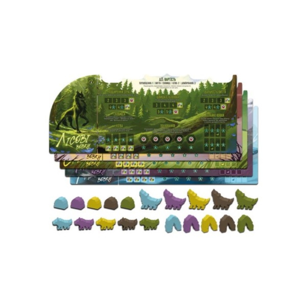 стартове поле; 10 полів регіонів; 10 жетонів підрахунку очок за регіони (трьох типів); 5 двосторонніх планшетів гравців; двосторонній планшет Місяця; 30 двосторонніх тайлів місцевості; 20 жетонів здобичі; 20 фішок альфа-вовків (п'яти кольорів); 40 фішок стайних вовків (п'яти кольорів); 60 фішок сховищ (п'яти кольорів); 20 фішок лігв (п'яти кольорів); 12 бонусних жетонів місцевості; 20 жетонів вовків-одинаків; 12 бонусних жетонів дії; 50 жетонів переможних очок; 4 жетони-нагадування про підрахуно