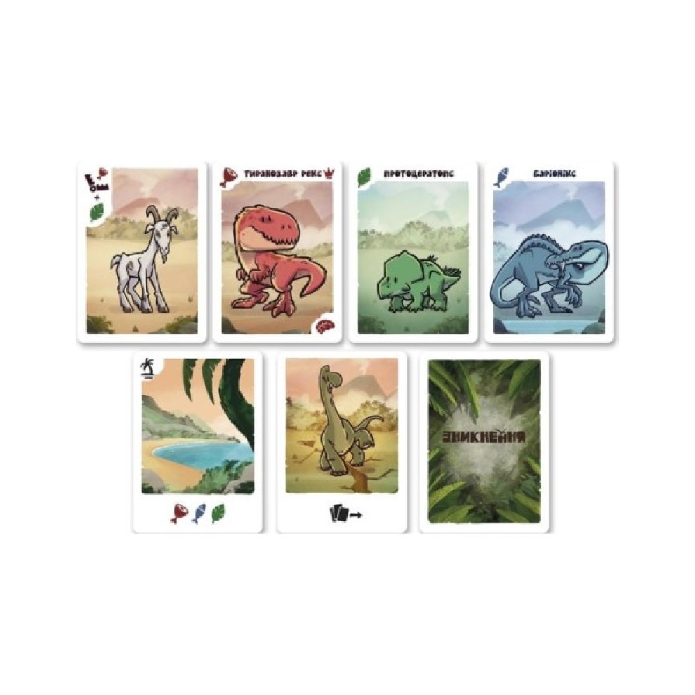 Крім стандартних карт, у наборі є порожня картка для творчості, надаючи гравцям можливість створювати власні правила та доповнення. Виміряйте свою стратегічну майстерність: здолайте загрозу вимирання та станьте найкращим рятівником доісторичних істот!