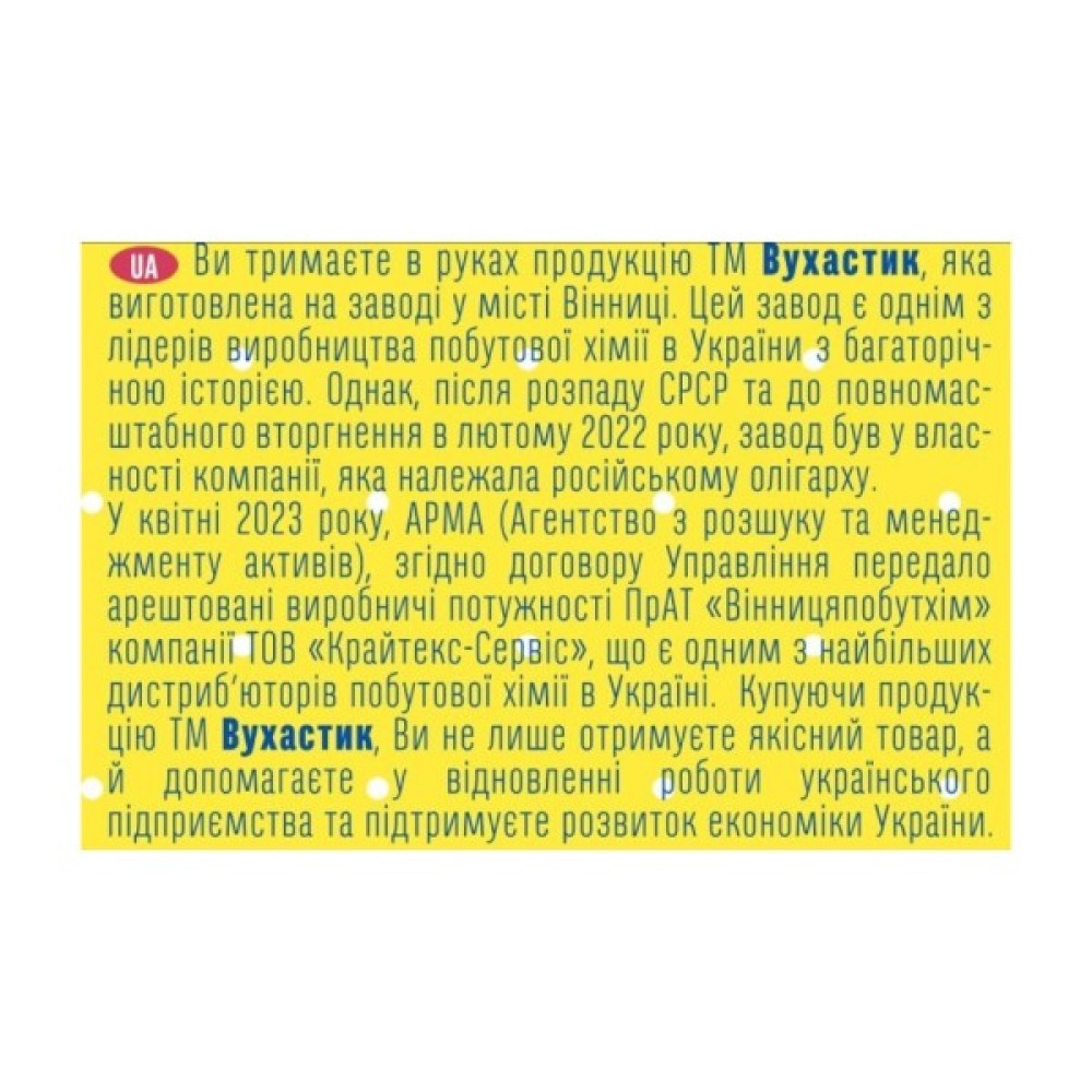 Практичність засобу полягає у його здатності пом'якшувати воду, а також захищати пральну машину від солей жорсткості. Вухастик підходить для ручного та автоматичного прання, забезпечуючи ефективність до 15 циклів використання. Відзначається дерматологічним тестуванням, що підтверджує безпеку.
