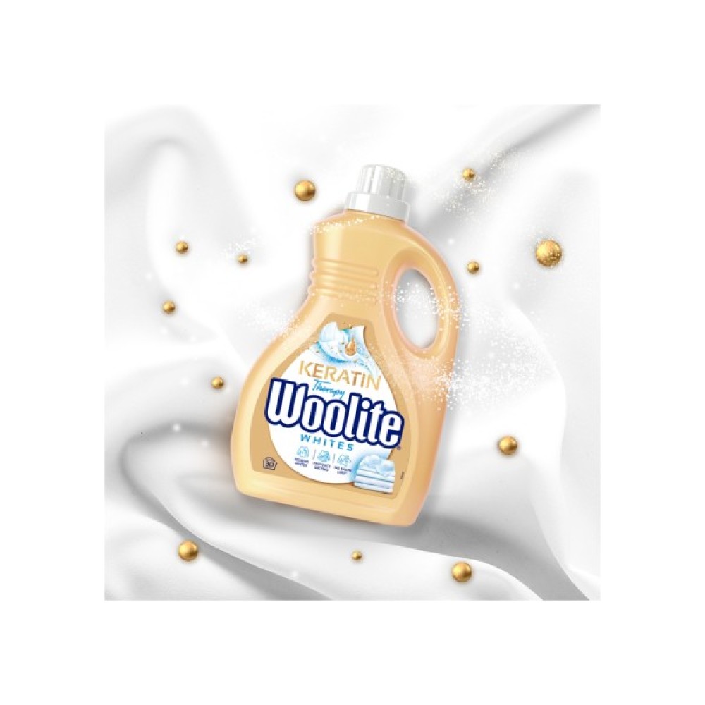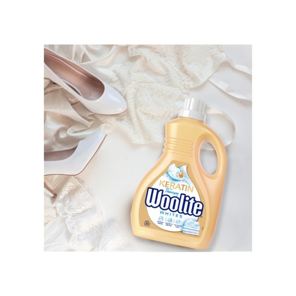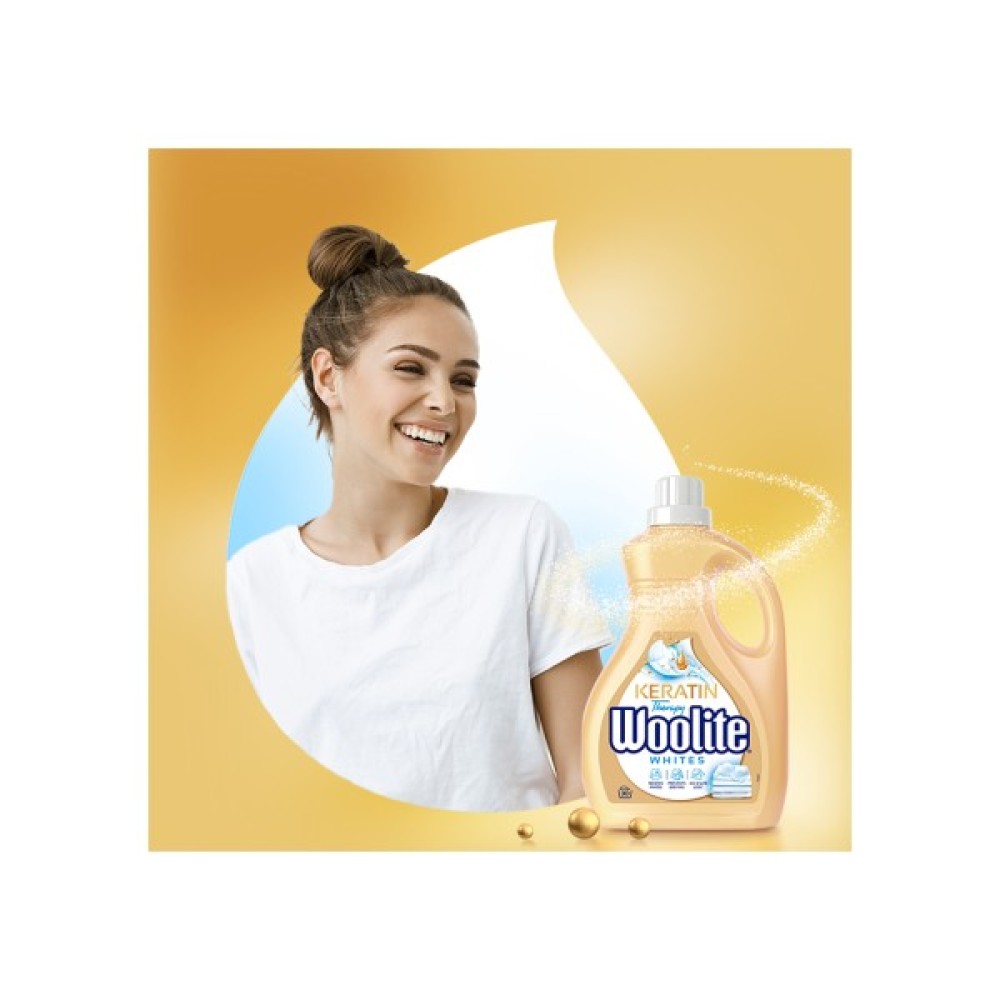 Особливе місце у складі займає кератин, компонент, відомий своїми захисними властивостями в косметиці. Він додає тканинам стійкості, захищаючи від зношування та пошкоджень під час прання. Цей інноваційний інгредієнт, підтримуючи волокна, дозволяє одягу залишатися м’яким та зберігає його первісну форму та колір. Більше того, Woolite запобігає появі сірих відтінків, повертаючи білосніжну яскравість вашим речам.