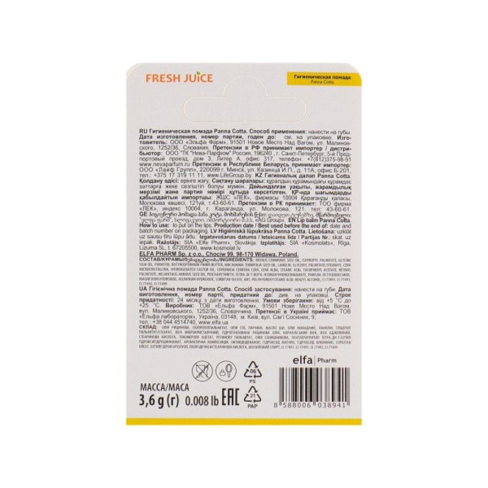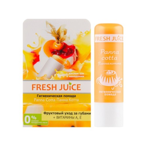 Для тих, хто піклується про свою зовнішність в будь-який час року, варто приділити особливу увагу захисту губ. Їхня ніжна, тонка, чутлива шкіра легко піддається негативному впливу зовнішніх факторів, стає сухою, з'являється лущення і мікротріщини. Завдяки гігієнічній помаді «Панна Котта» майстрів українського бренда Fresh Juice ви зможете уникнути всіх цих проявів. Виріб має безпечний склад, який підходить як дорослим, так і дітям, а у формулі відсутні барвники, тому вона підійде і чоловікам і жінкам.