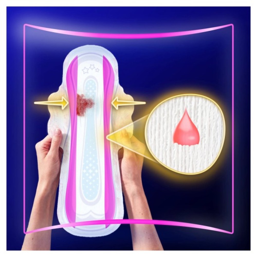 • Наші найдовші та найширші прокладки з технологією ЛікГард і супергігроскопічними властивостями захищають від протікань упродовж усієї ночі.
