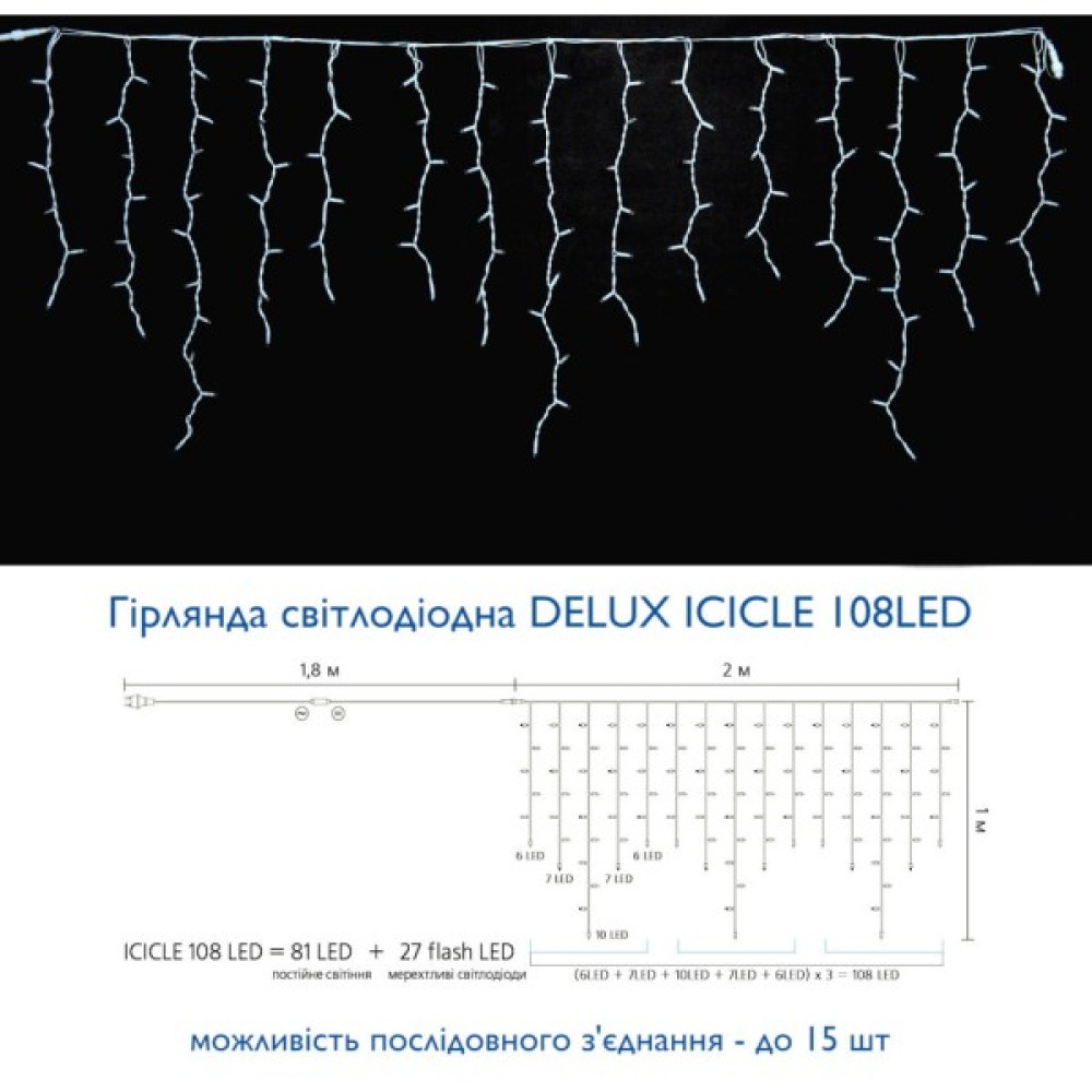 Гірлянда, Delux, ICICLE, flash, 108LED, 2, х, 1, м, теплий, білий, білий, IP44, EN, 90012948