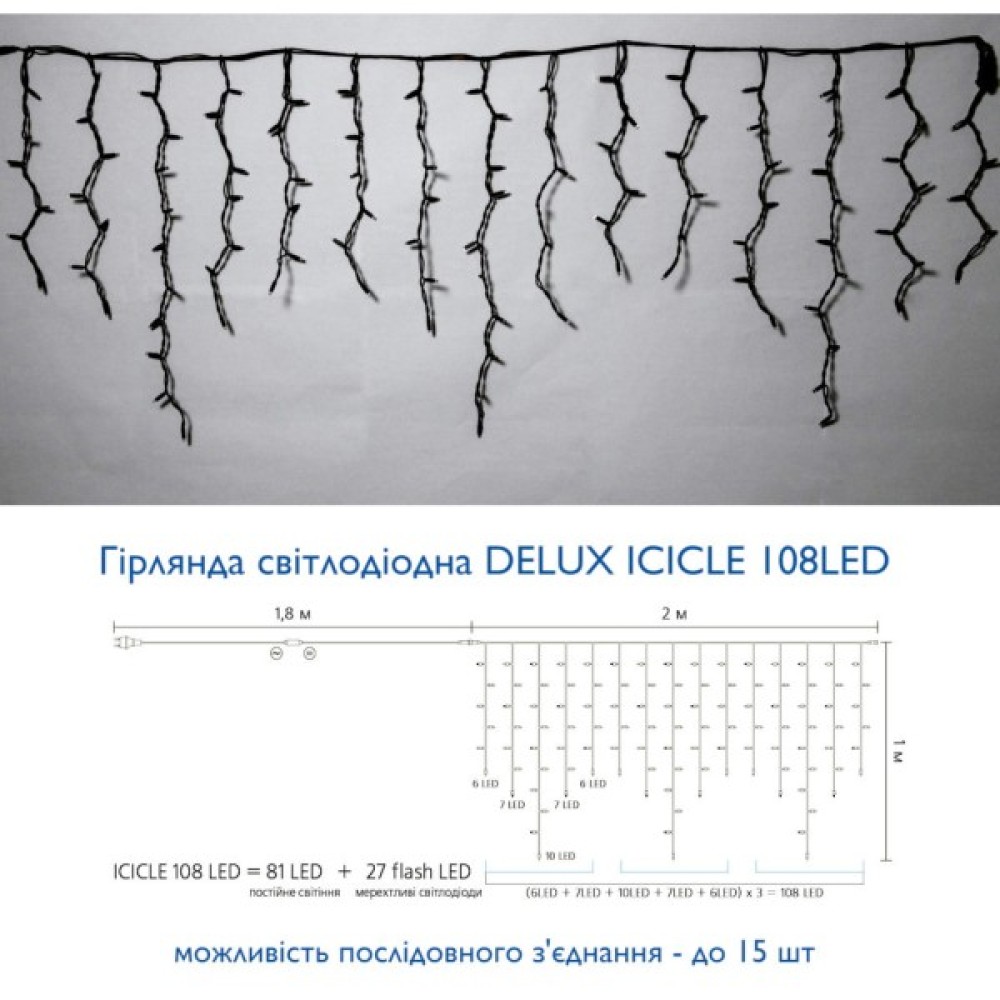 Гірлянда, Delux, ICICLE, flash, 108LED, 2, х, 1, м, теплий, білий, чорний, IP44, EN, 90012947